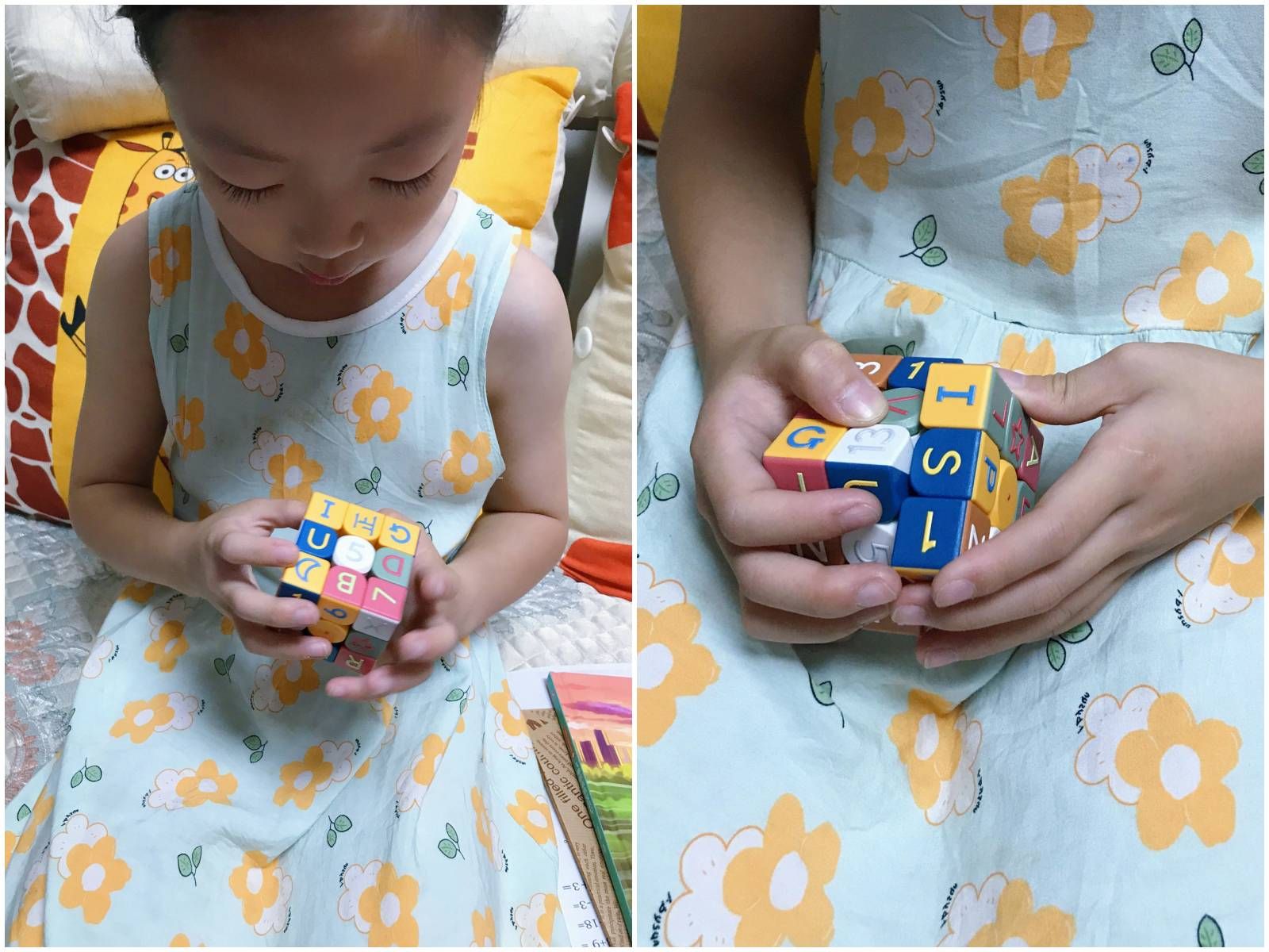 而且这魔方不用拼色,3岁以上就能玩。孩子现在会自己琢磨延伸玩法,比如找偶数、拼单词,拼单词时还会用手写板先写下来,再对着魔方找字母,玩得特别投入,连看电视的时间都主动减少了。