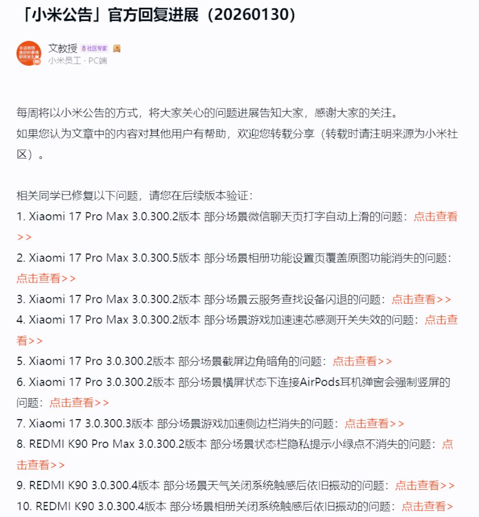 这份沉甸甸的“修复清单”,主要集中在当下热度最高的小米 17 系列与 REDMI K90 系列上。