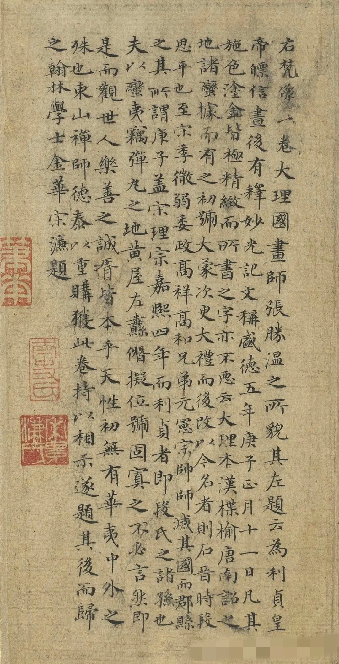 这幅为南宋大理国张胜温《梵像卷》的题跋,是他小楷的传世精品。通篇小楷,笔笔藏锋,如老僧入定,却于规整中见灵动;墨色浓淡相宜,纸色古雅,若盛唐遗韵落于滇云。