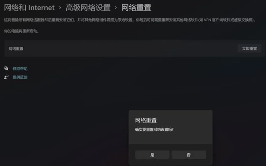 点击【立即重置】→【是】,系统会完成网络重置,重置后电脑会自动重启,重启后再看网络是否恢复。