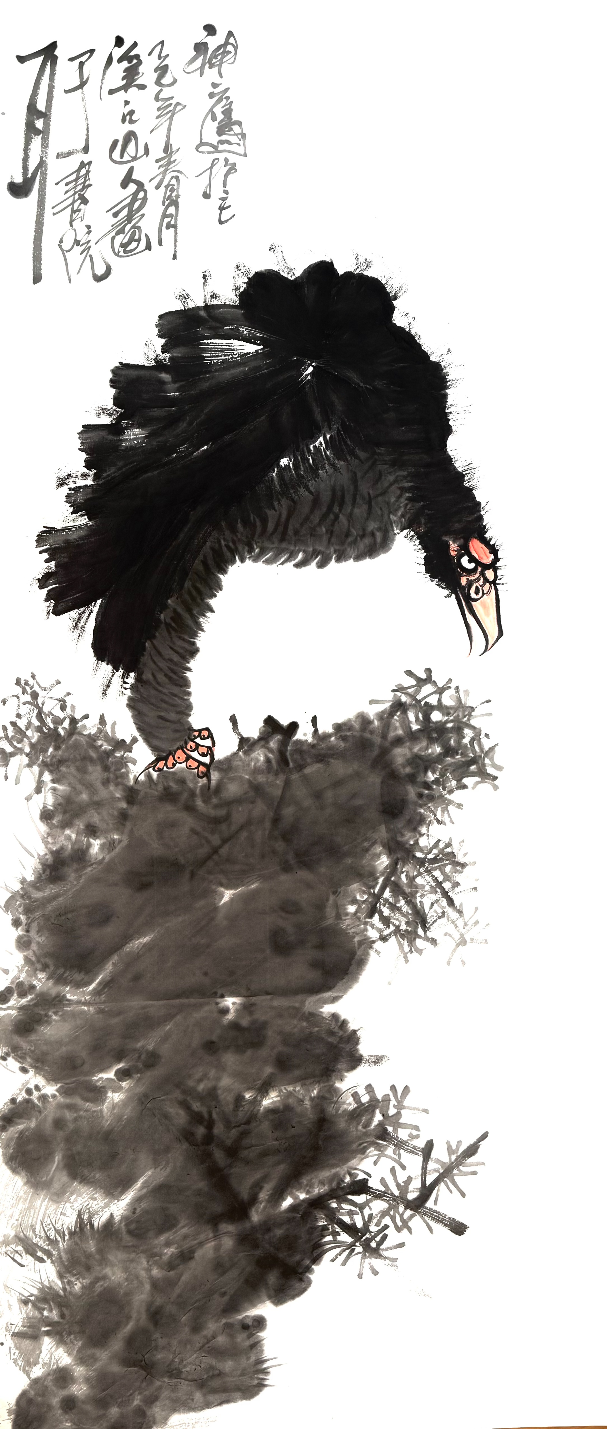 玻璃大王曹德旺收藏的《神鹰护主》,恰是这种艺术特质的完美体现。画中鹰隼立于苍松之巅,墨色浓淡相宜,爪喙细腻如生。最妙的是那双眼睛——不是传统鹰画中的凌厉锋芒,而是透着智慧与沉静的凝视。这种"萌态"处理非但没有削弱鹰的王者气度,反而赋予其更具现代审美的人文温度。