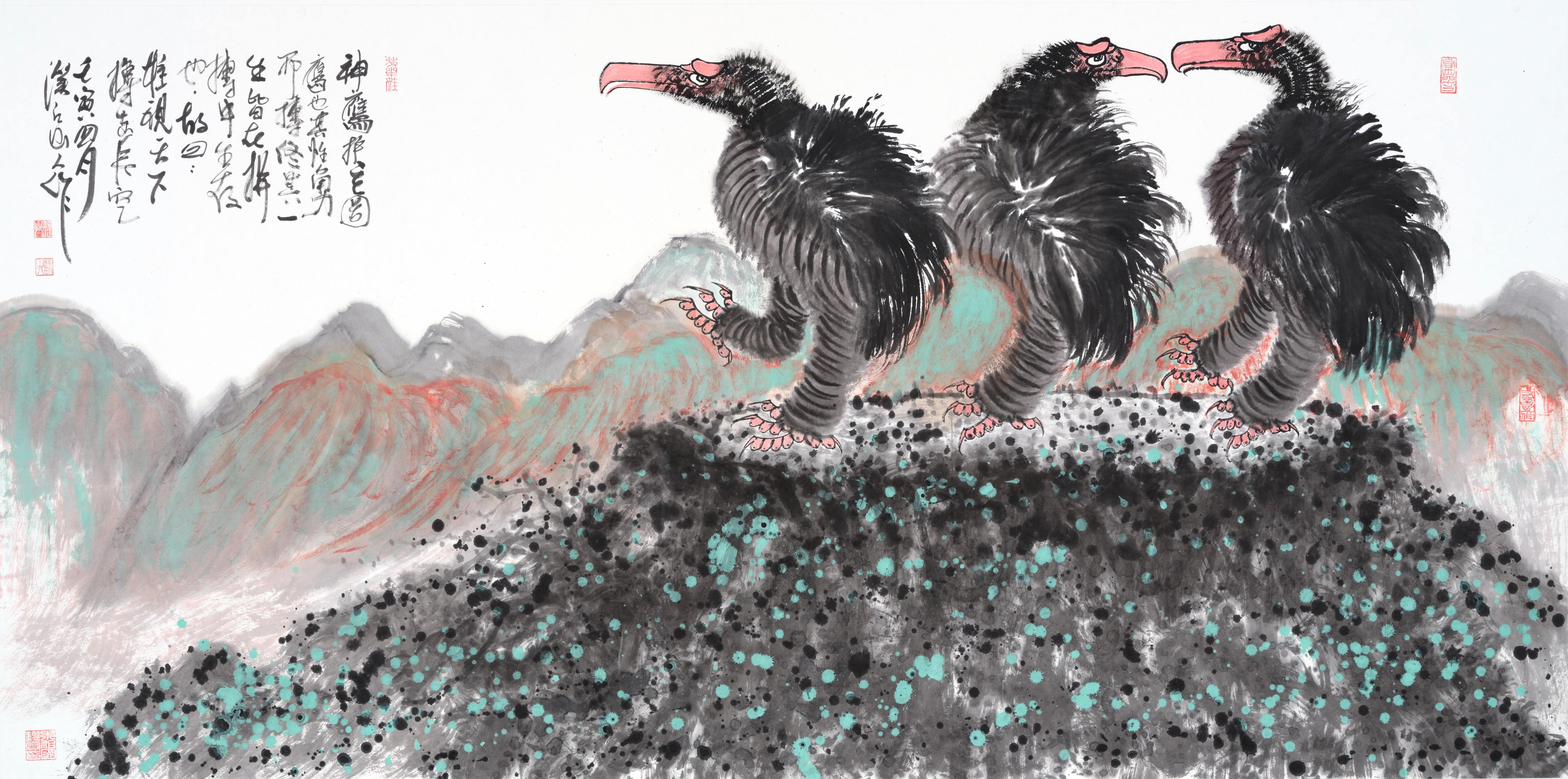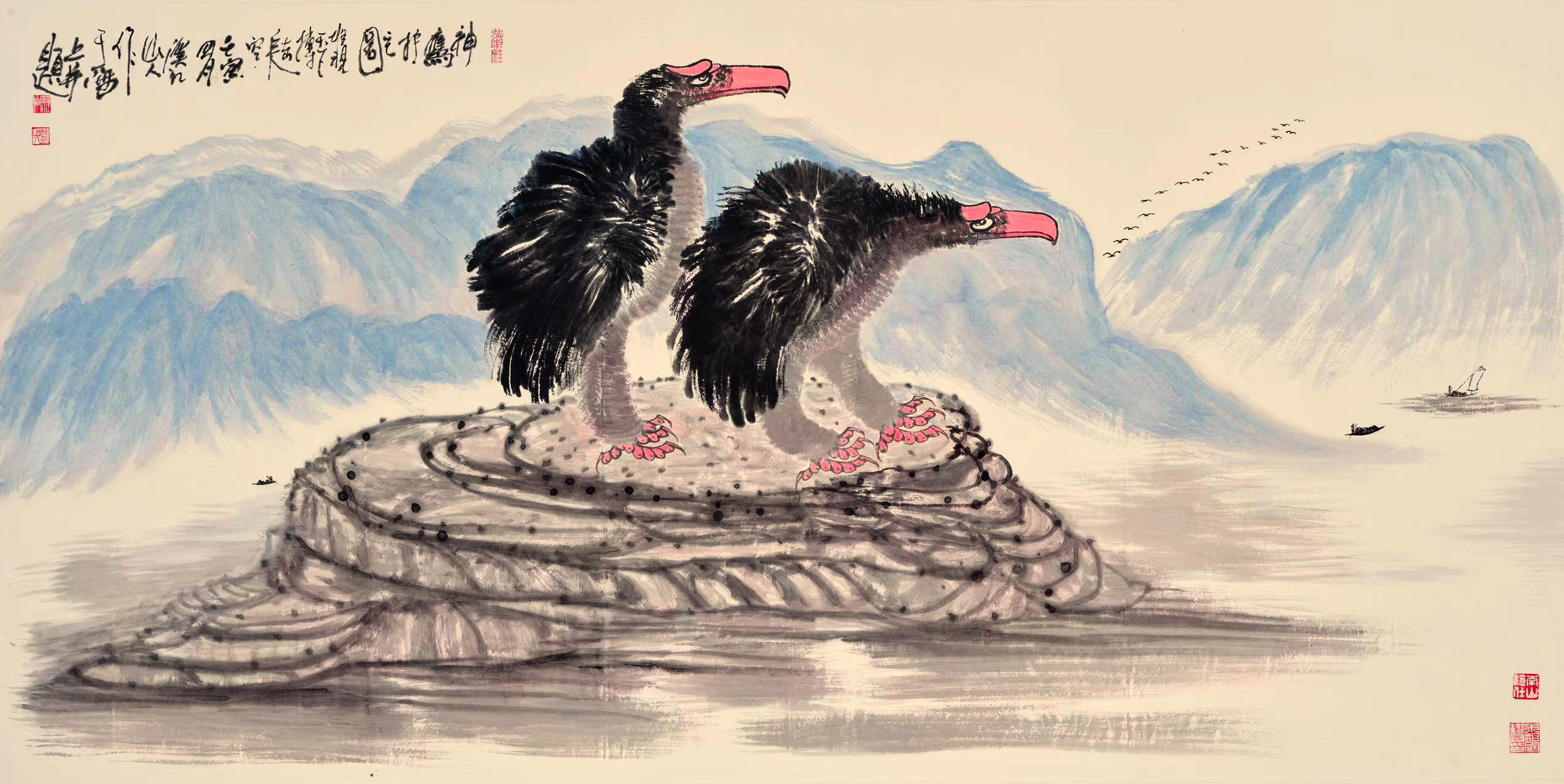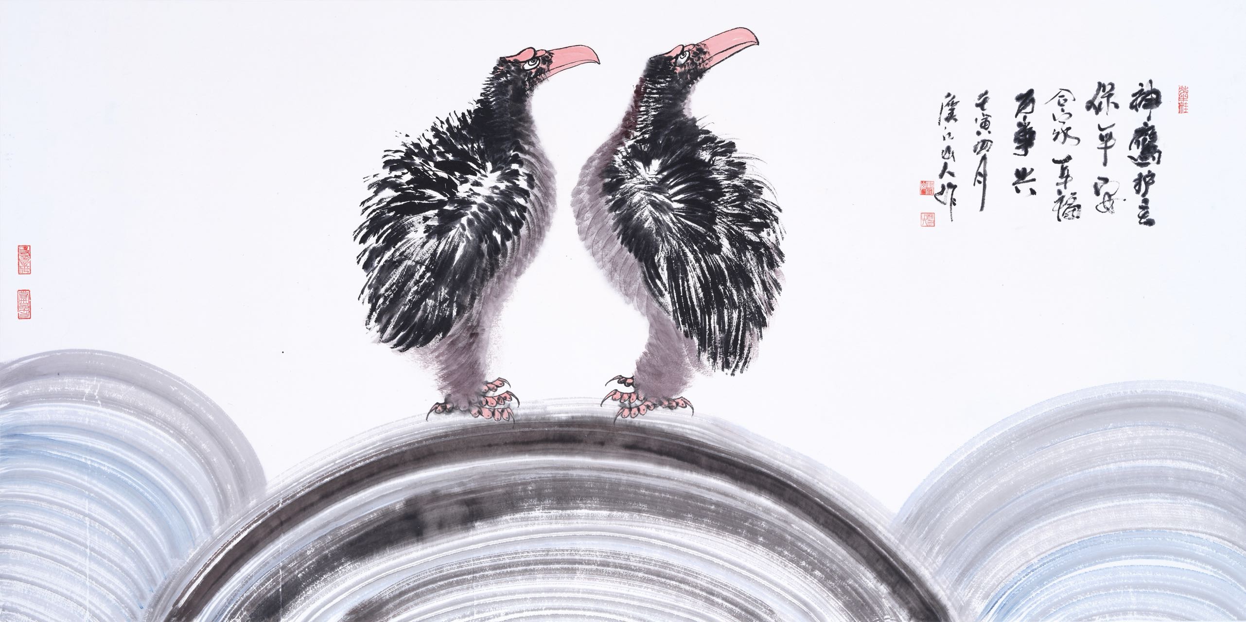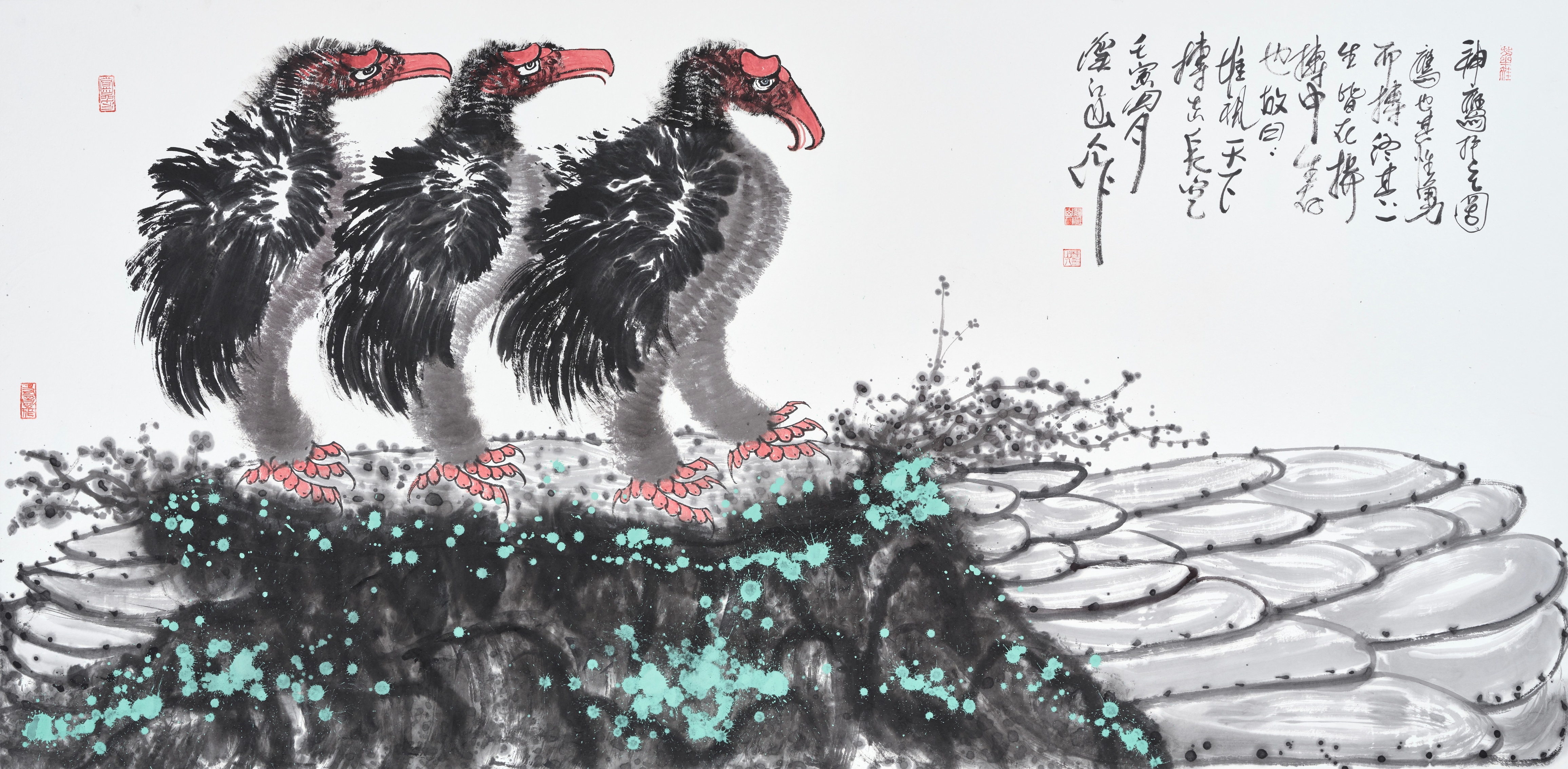 朱祖国的创新之处在于,他打破了传统鹰画"以凶显威"的程式化表达。在《鹰石山花图》中,我们看到的是鹰与自然的和谐共处;在《群英荟萃》里,展现的是群体互动的生动趣味。这种创新不是对传统的背叛,而是将八大山人的孤傲、齐白石的意趣融入当代审美的成功尝试。