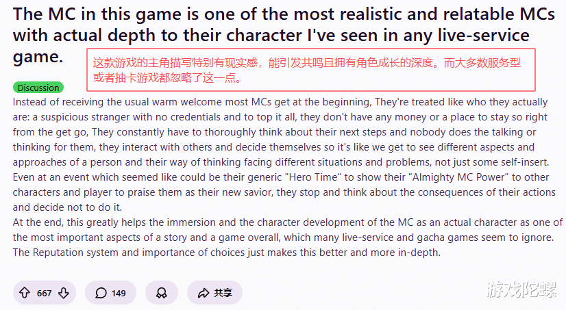 此外,陀螺注意到了非常有趣的一点是,尽管文化背景不同,但有相当多的海外玩家提到了《二重螺旋》十分与众不同的一点:剧情和人设。