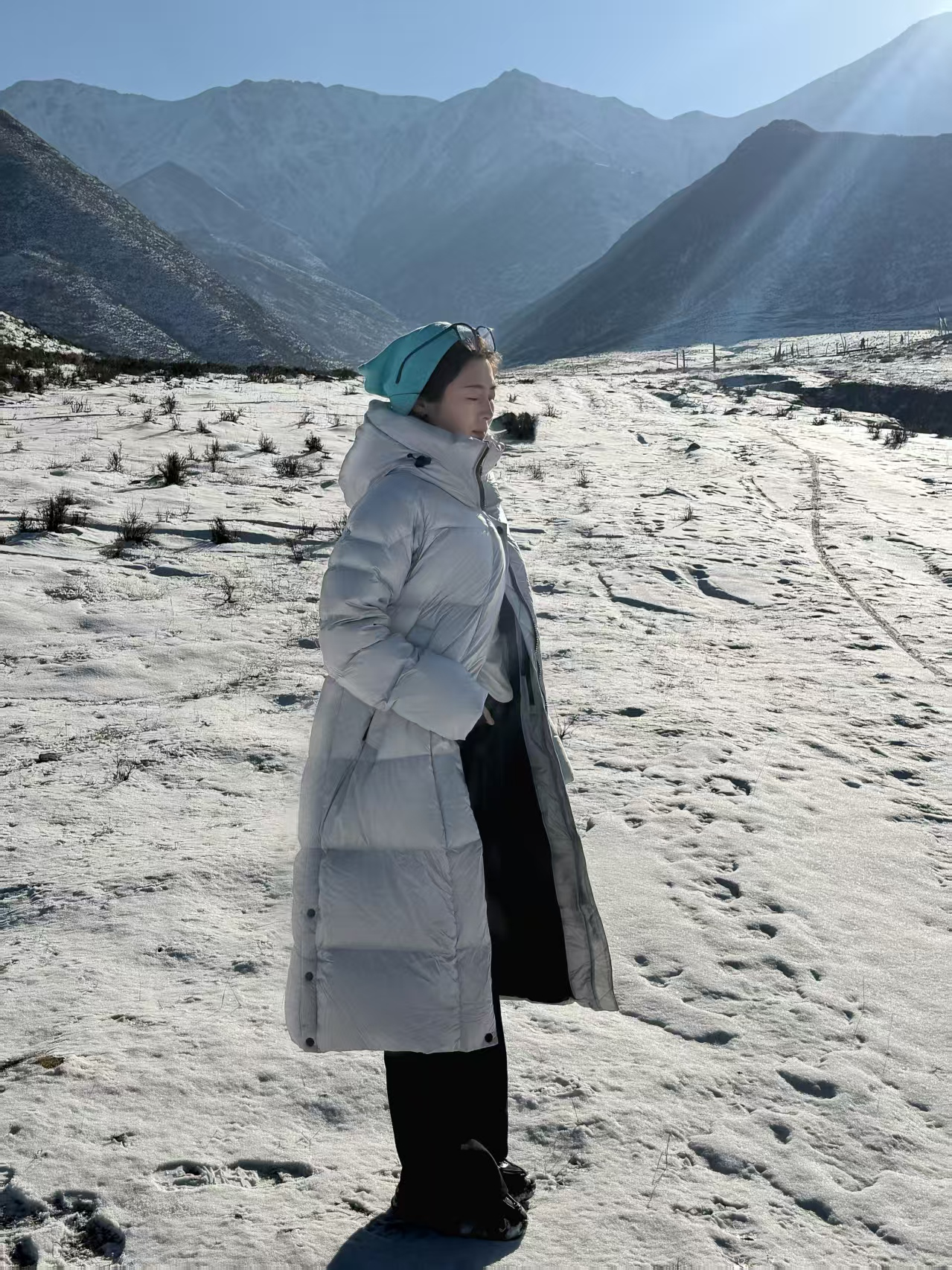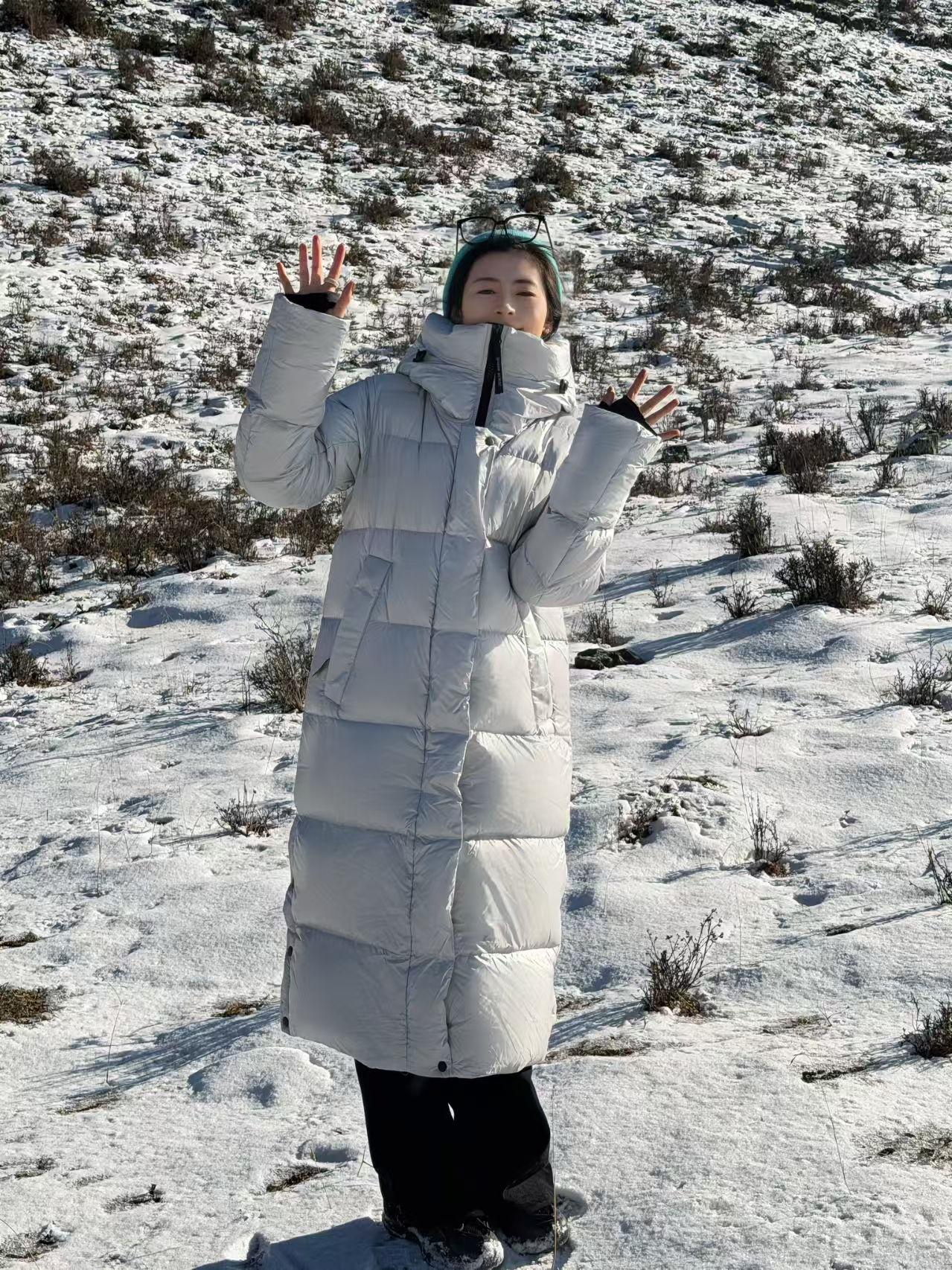 这个地方对我来说有一种神秘感。我一直想看看天池冬天的样子,也想体验一下真正的冰雪森林。如果我穿这件长款羽绒服去,我觉得哪怕风再大、雪再厚,我也能在外面慢慢走,不会急着往酒店跑。