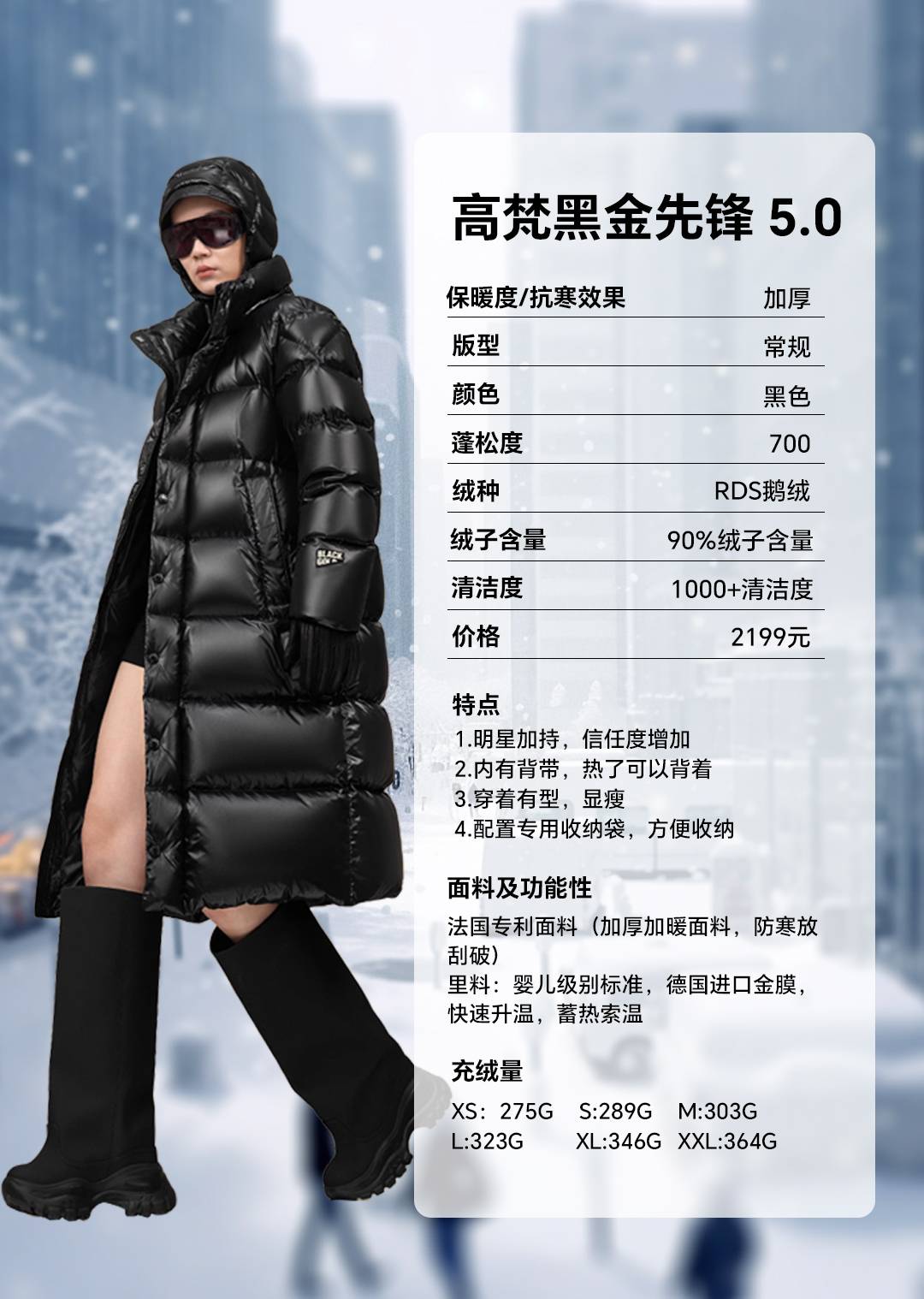 高梵黑金先锋5.0强调科技感,填充量230克左右,清洁度1000+,版型是常规款。颜色比较克制,主打黑色。价格2199元,风格更现代一些。