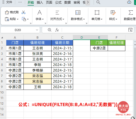 公式中首先通过FILTER函数,按条件筛选出指定门店的值班经理名单,然后再通过UNIQUE函数提取出不重复的名单数据即可。