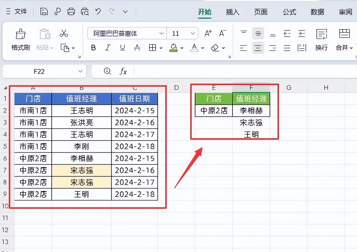 如下图所示,这是一个假期值班表格,我们需要根据所属“门店”这个条件,筛选出不重复的“值班经理”名单。