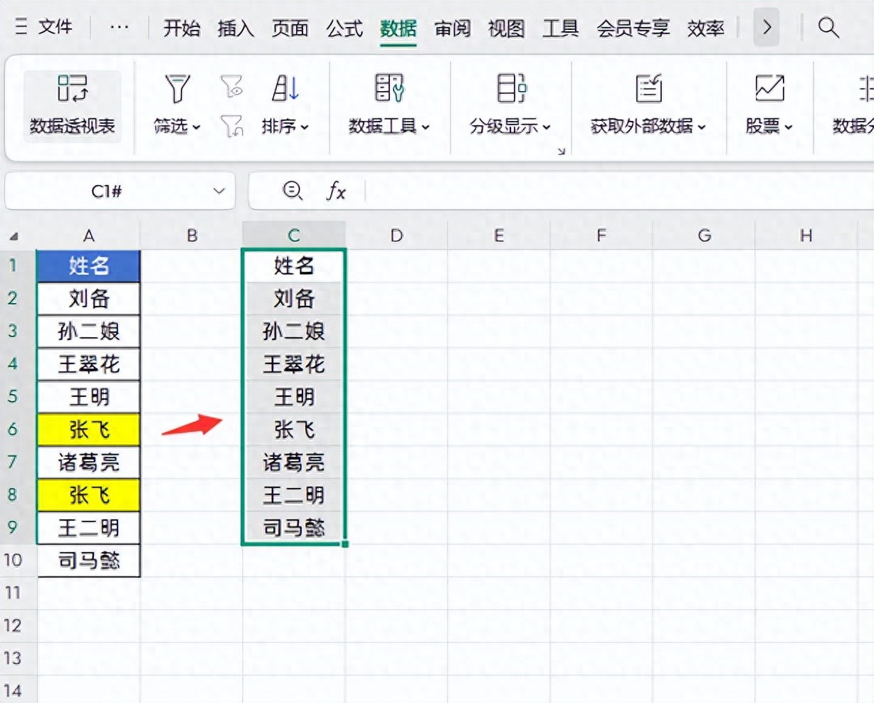 如下图所示,左侧是一列名单信息,我们需要去掉里面的重复值。