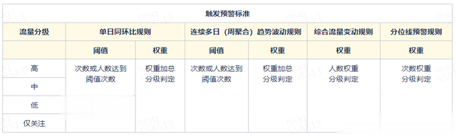 在得到各规则的对比权重值后,同样根据流量分级进行分类加权,对加权结果进行阈值或权重的过滤,以确定在该规则下是否触发预警(具体参考“触发预警标准表”)。再根据不同的业务需求,叠加多个规则进行最终的数据预警,以确保预警的精准性,并有效降低预警的噪音。
