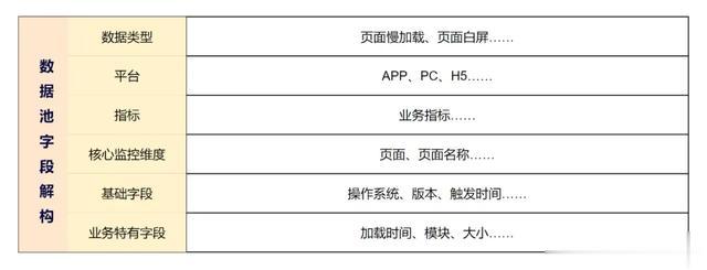 拆解来看,将数据池划分为六大字段维度:数据类型、平台、指标、核心监控维度、基础字段以及业务特有字段。细致的数据维度分类不仅使得数据汇总更加直观,同时也大大提升了数据的结构化处理能力、降低后续使用成本。