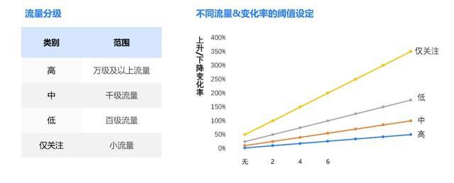 从数据池获取数据时,把数据本身的流量进行分级,分为高、中、低、仅关注四级。根据类型不同,并针对不同流量级别设置了合理的变化率阈值。流量越大,则对变化率越敏感。