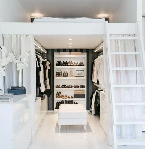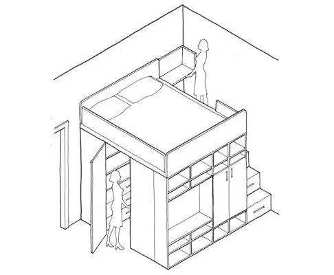单独打造一个衣帽间在房价飙升的今天是很奢侈的,许多人家的户型是LOFT挑高小户型(卧室层高>3.8m),利用高度差打造衣帽间区域再好不过。