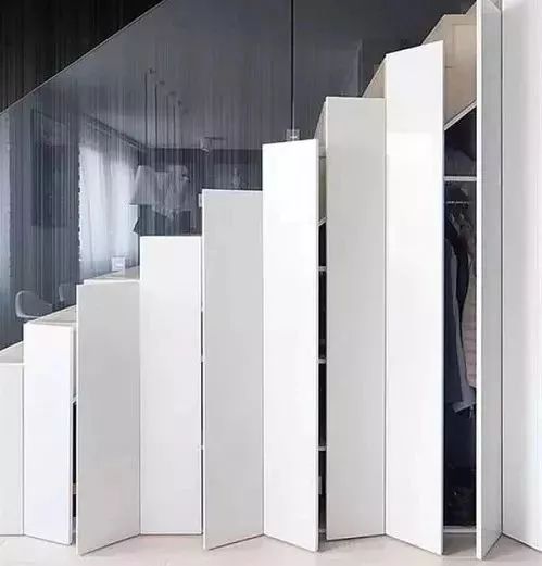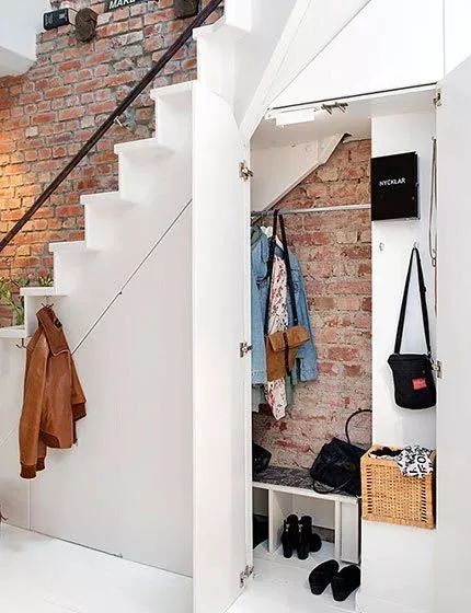 对于小LOFT来说,楼梯下斜斜的空间一般用作储藏室太过可惜,它可是绝佳的改造位置。稍微用点小心思,就能拥有一个别有洞天的衣帽间哦!
