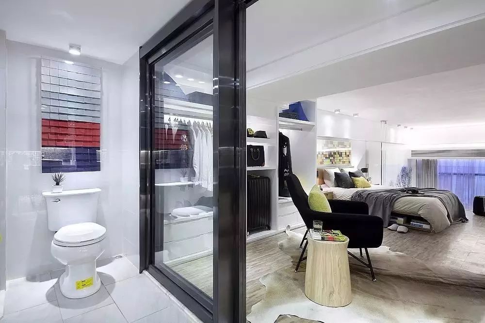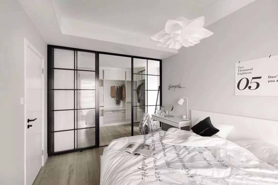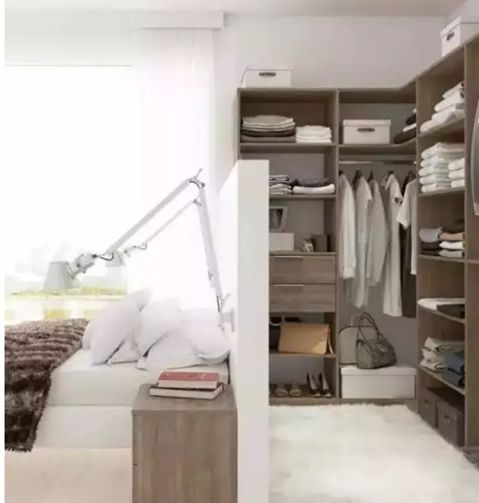 如果嫌麻烦,可以不用做隔墙,床头本身就可以当成隔断,这种不完全封闭的衣帽间,在光线不错的情况下,还能把衣帽间作为展示区域。