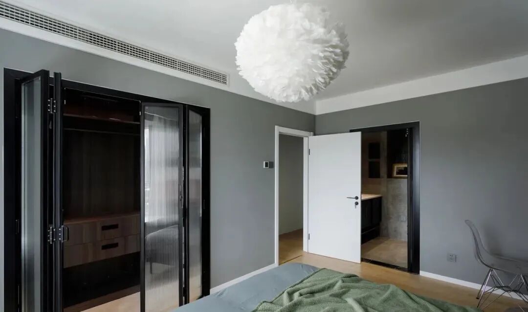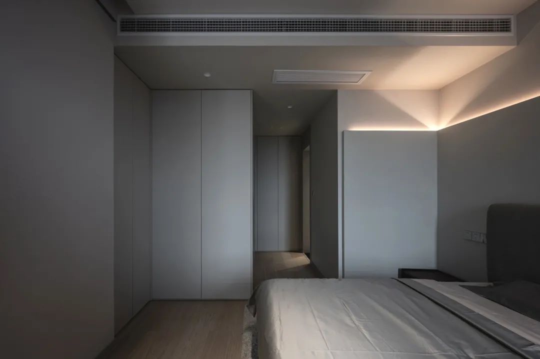 小卧室最佳的选择就是做到顶的定制衣柜,顶天立地。柜门饰面成了墙面的一部分,降低房间内的琐碎感。