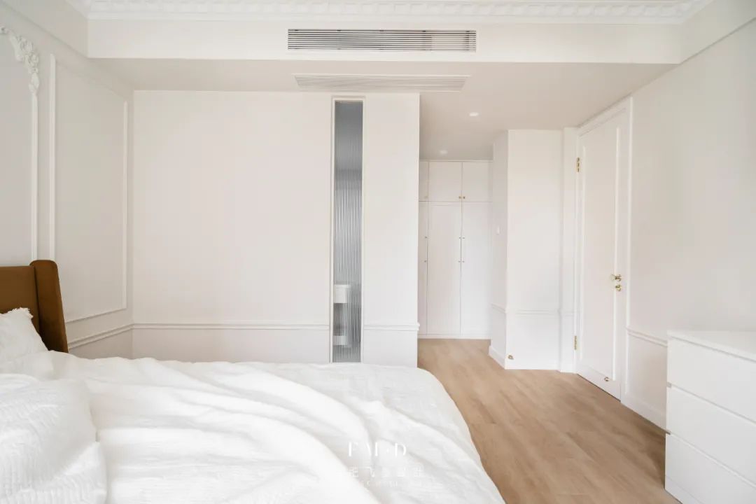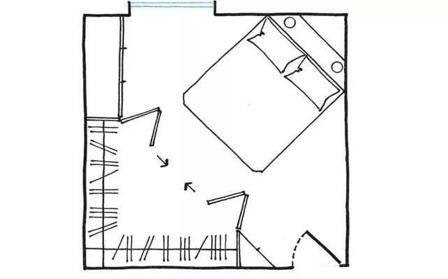 如果卧室不大,我们找到房间一角,利用“L形”布局和床头,拼出一个三角区域,卧室衣帽间就诞生了。