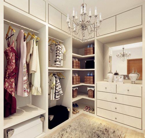 卧室面积稍大的也可以设计成“L形”衣帽间,容量更大。而且房间内侧的柜子可以打造“顶柜+矮柜”组合,主人能够在台面上摆放首饰、包包、化妆品,还可以做一些衣物整理的家务活。