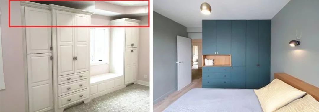 大多数户型卧室开门可见衣柜和大床,如果你的卧室很小,放上一张床之后,剩下的空间也就只够走路的。再加上一个够不到天花板的成品衣柜,空间浪费而且视觉也比较方式压抑。