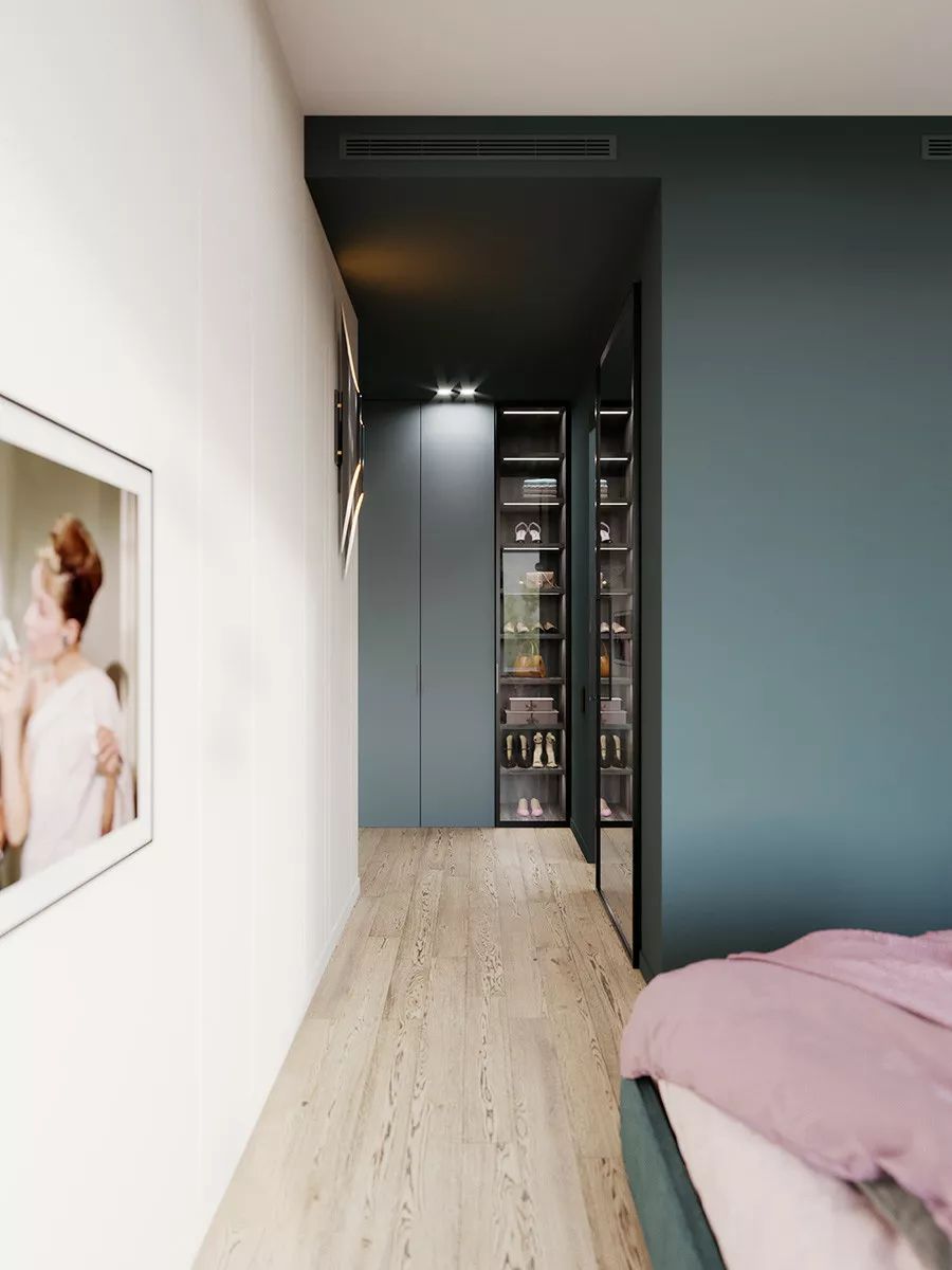 有些方形比较特殊,进入房间后会有一段走廊。将卧室门口的过道利用起来,每次进入房间,都会经过自己美美的衣橱。