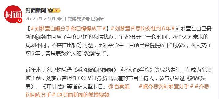2月21日晚22:45,齐思钧在微博写下:“谢谢大家关心,分开是我们认真考虑后共同做出的决定。感谢曾经彼此的陪伴,祝福我们未来会更好。”言辞简洁,态度清晰。而这份声明,与刘梦章早前在个人视频中的坦诚剖白,形成了高度一致的“联合公告”。