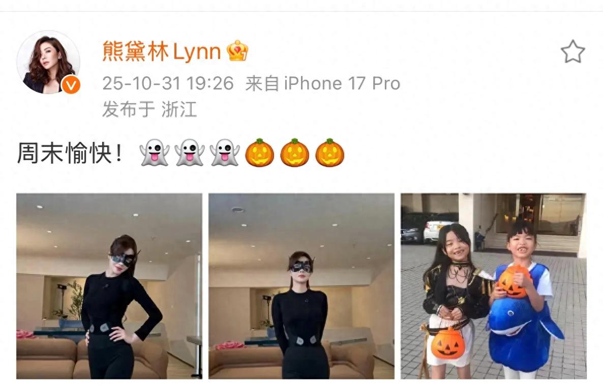 10月31日,熊黛林在社交平台晒出和双胞胎女儿一起过万圣节的照片,母女三人玩cos,造型好酷。