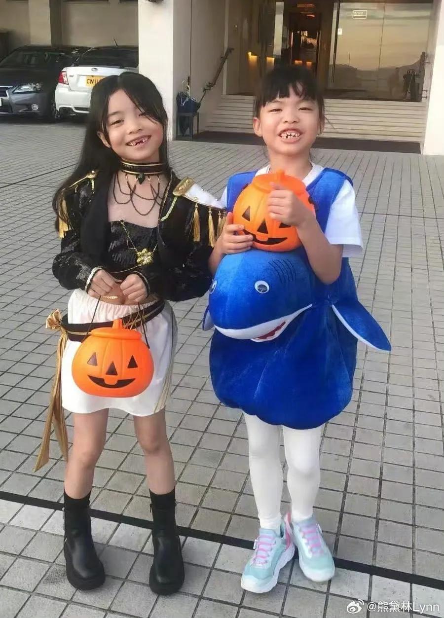 两个双胞胎女儿也扮上自己喜欢的造型,姐姐Kaylor身穿黑金打歌服cos猎魔女团,黑色上衣搭配白色裙子和短靴,甜酷少女范。妹妹Lyvia穿着蓝色鲨鱼玩偶服,cos鲨鱼宝宝,造型可爱十足。姐妹俩提着南瓜灯,面露灿烂笑容,好可爱。