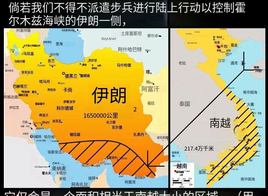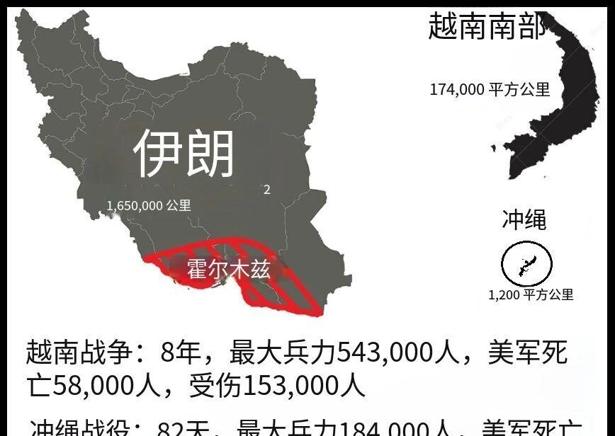 很多人对这场战争的真实规模估计都很乐观,可能还真没意识到伊朗到底有多大。可以试着比比看南越、冲绳和伊朗沿岸的面积,心里会更有数:整个南越当年17.4万平方公里,基本就和伊朗“守”住霍尔木兹海峡的这一片差不多大。如果美军真想把所有伊朗导弹阵地全都铲灭,确保不再有飞来的威胁,那难度恐怕不比越战小,一场硬仗在所难免。