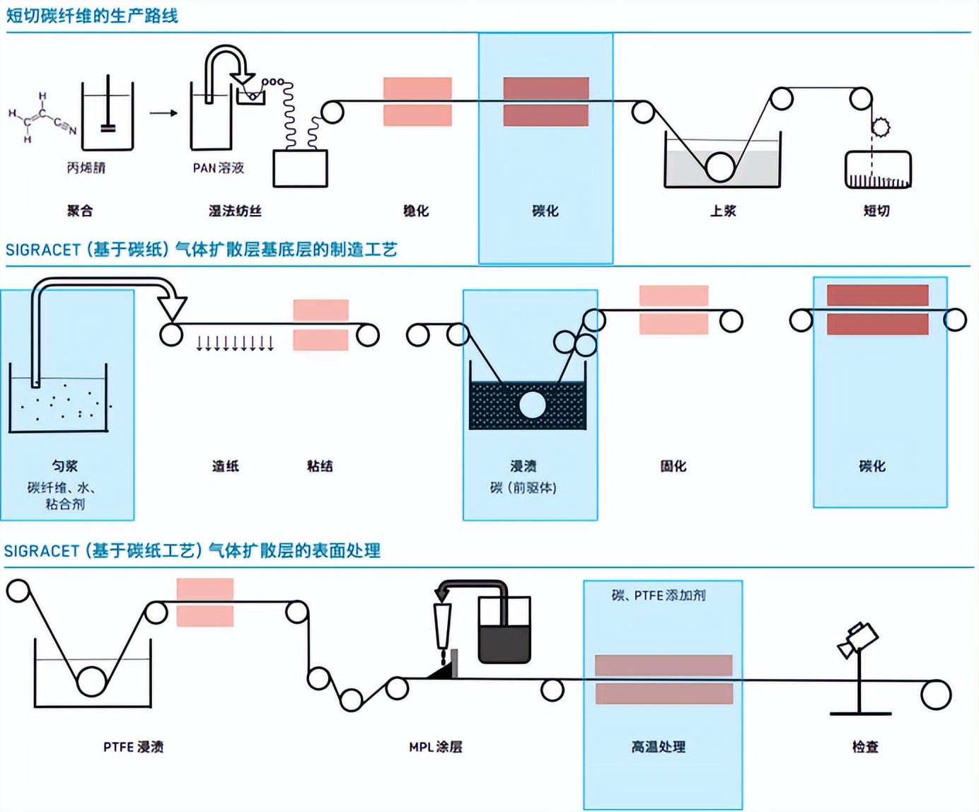 碳纸,又称为碳纤维纸,是燃料电池堆气体扩散层(Gas Diffusion Layer)的关键基底材料。主要使用湿法工艺制备而成:将短切碳纤维(5-20mm)分散在粘合剂溶液中,再经树脂浸渍、固化、碳化、石墨化等工艺处理。
