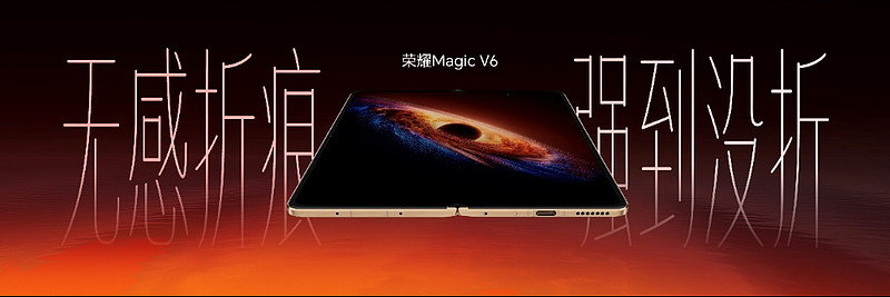 荣耀Magic V折叠屏系列自诞生之日起,就在不断刷新折叠行业品类上限。此次荣耀Magic V6不仅在极致轻薄上持续引领,更首次将折叠屏电池容量带入7000+mAh时代,续航实力跨代领先。内外均采用荣耀自研至臻黑钻屏,国际顶级七大权威认证诠释顶级屏幕素质。全新荣耀盾构钢铰链和超强整机防尘防水,将可靠性拉满。同时,凭借满血性能和出色影像配置,以及全新AI生产力和跨生态互联体验,带来从内核到外观,从硬件到软件的“折叠屏大满贯”实力。