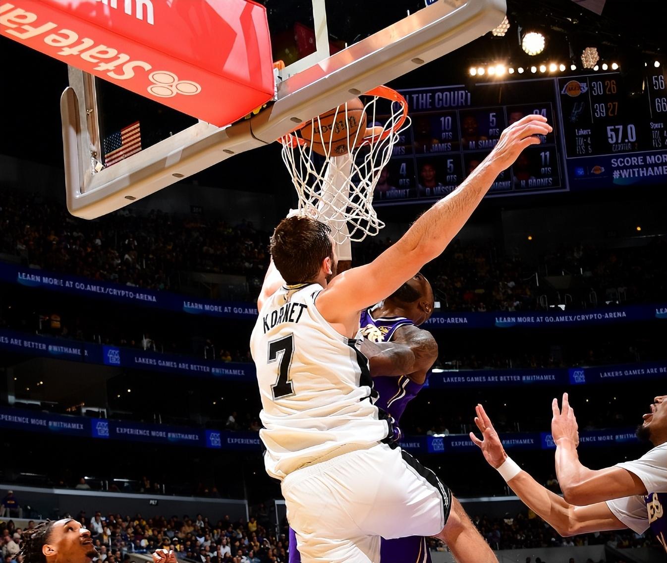 36 分钟高强度输出!詹皇轰准三双 + 赛季新高篮板!作为球队核心,詹姆斯首发出战 36 分 26 秒,进攻效率稳定:14 投 7 中,罚球 6 中 5,砍下 19 分,同时疯狂揽下 15 篮板(赛季新高),还送出 8 次助攻和 3 记盖帽,攻防两端全面开花。比赛中他的两个高光时刻堪称炸裂 —— 一次是突破后迎着科内特完成暴力隔扣,点燃全场;另一次是快速回防,追身大帽福克斯的反击上篮,展现了 41 岁老将依旧顶级的身体素质。