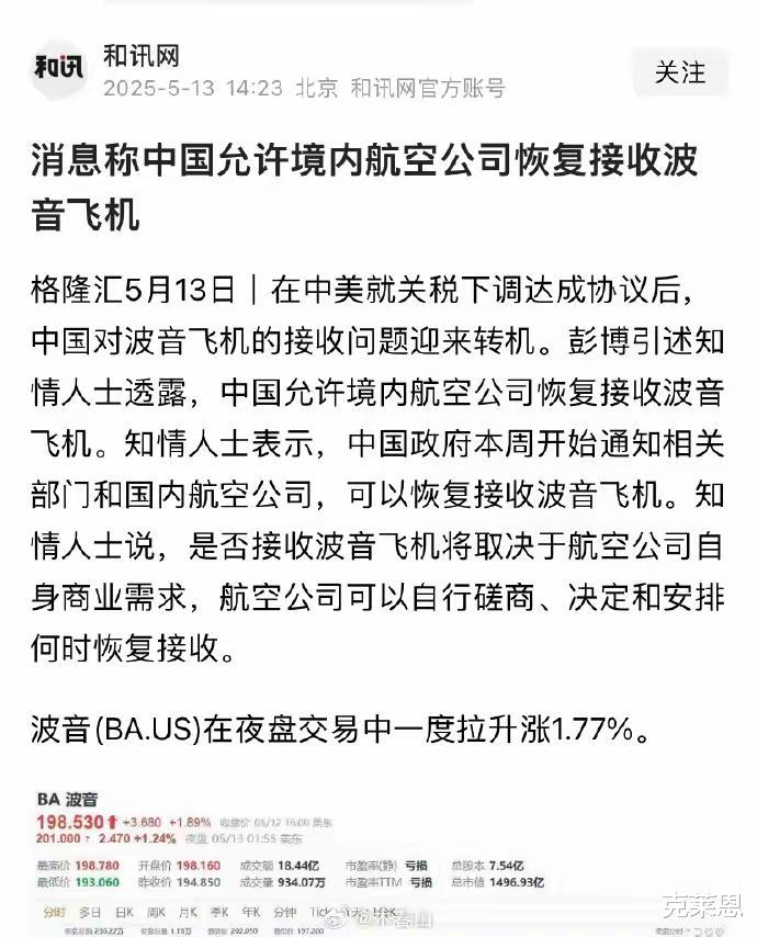 现在中国政府直接通知有关部门和国内的航空公司,可以恢复接收美国波音生产的飞机了。
