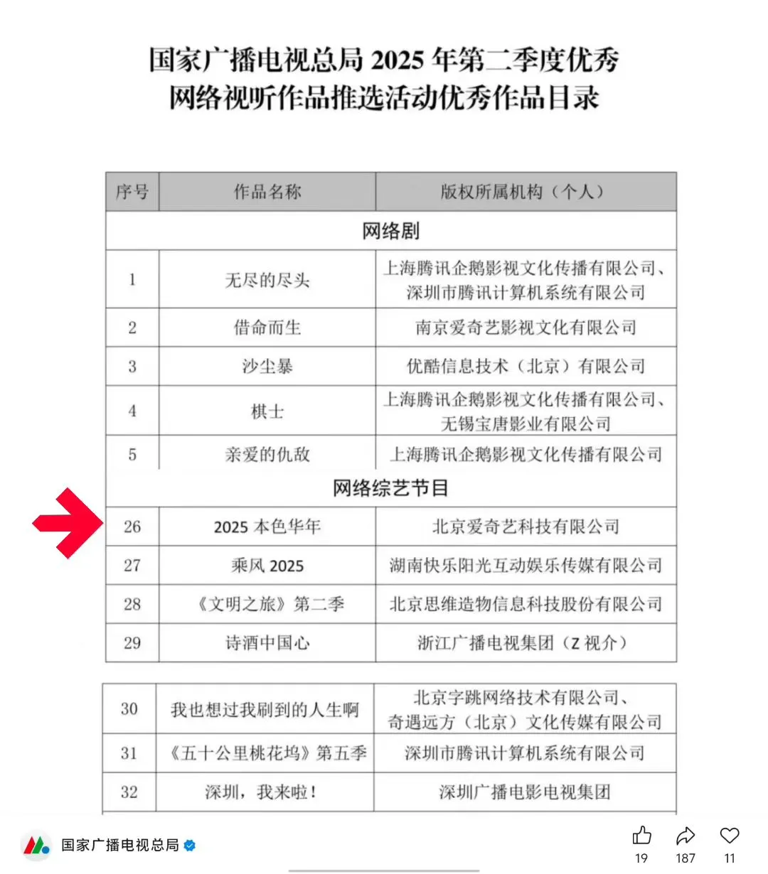 为深入学习贯彻习近平文化思想,深入实施广播电视和网络视听精品创作工程,进一步鼓励网络视听行业创作生产高质量视听内容,充分发挥优秀网络视听作品的示范引领作用,营造良好创作传播生态,国家广播电视总局近期组织开展了2025年第二季度优秀网络视听作品推选活动。经省级广电行政部门和中央直属单位等推荐,专家评审委员会评审等程序,最终研究确定99部作品入选,现将结果予以公布。