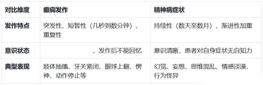 但两者有本质区别:癫痫发作是 “突发性、短暂性” 的,发作后患者意识能恢复正常;而精神病的异常行为是 “持续性” 的,可能持续数天、数月,且患者通常不认为自己有问题(无自知力)。
