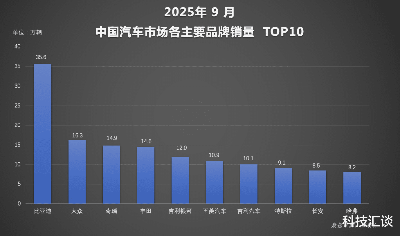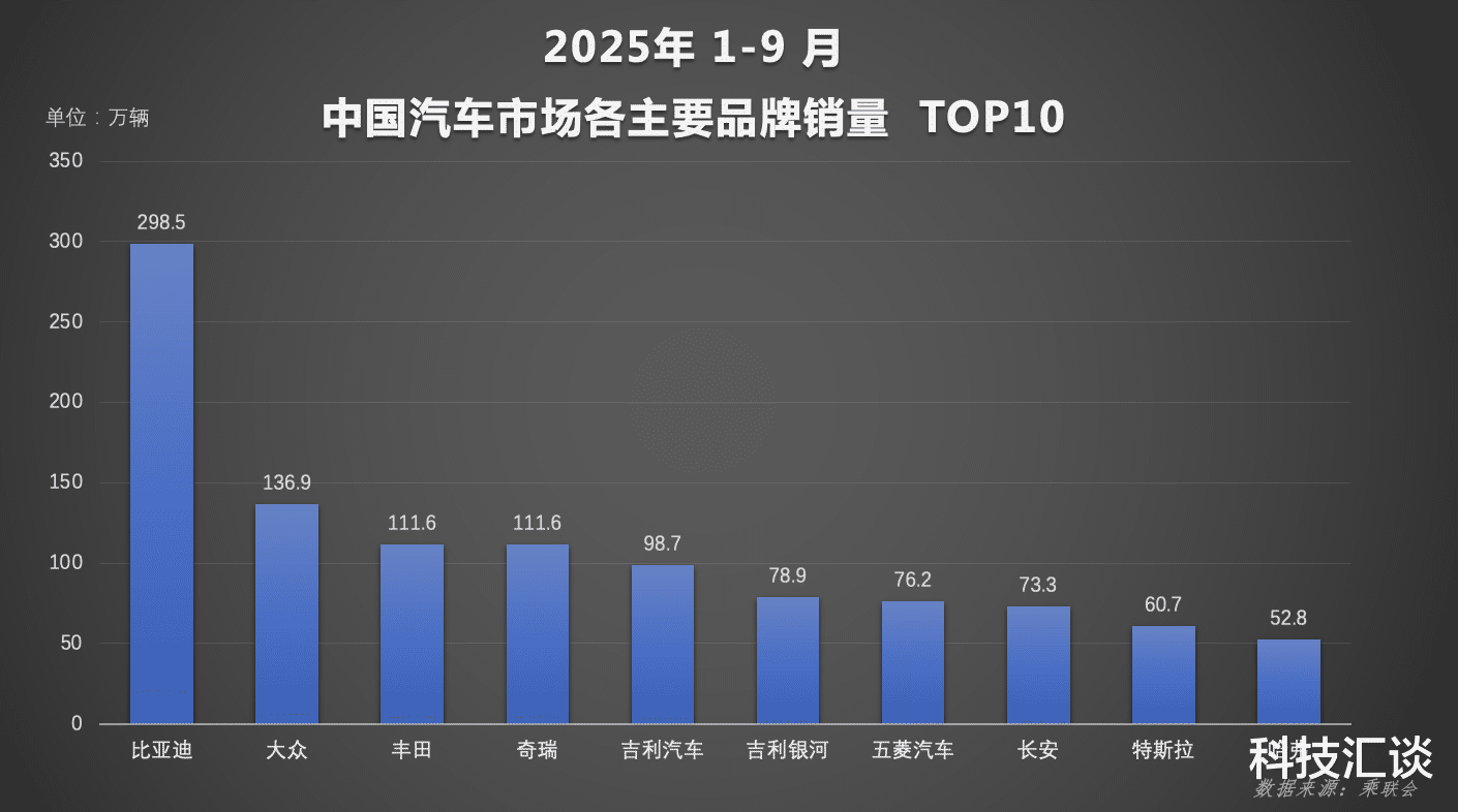 分享一个好消息,国产汽车再次迎来高光时刻!中汽协数据显示,9月全国汽车产销首次突破300万辆。其中,比亚迪以绝对优势领跑新能源汽车赛道,月度及前三季度销量均居中国车企集团榜首,全维度领跑市场。比亚迪新能源车销量达39.6万辆,同比增长18.6%;1-9月累计销量突破326万辆,完成全年目标的71%。其中,比亚迪汽车(王朝丨海洋)品牌销量稳居单一品牌冠军,头部地位持续巩固。智能化方面,比亚迪“天神之眼”辅助驾驶系统搭载车型累计销量突破170万辆,日均辅助驾驶数据里程超1亿公里,为算法优化提供坚实支撑。在智能驾驶辅助车型品牌销量榜中,比亚迪以断层式优势荣登榜首。全球化加速,9月比亚迪海外销量达70,851辆,同比增长107%;1-9月累计出口超70万辆,占集团总销量的22%。宋PLUS、海狮等多款车型海外热销,10月9日,比亚迪在巴西迎来第1400万辆新能源汽车下线。技术为本,行稳致远。比亚迪依托超级e平台、“天神之眼”等技术,不断刷新新能源汽车技术上限,在产业变革中引领中国新能源汽车走向世界。