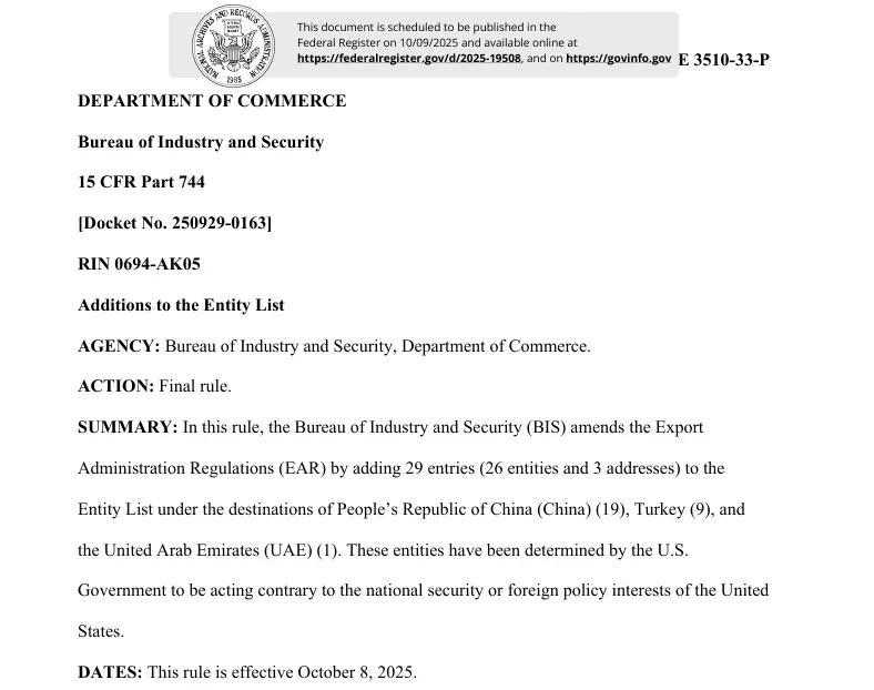 10月8日,美国商务部工业与安全局(BIS)发布了一项“突袭式”最终规则:一口气将26家公司、3个地址正式列入出口管制“实体清单”(Entity List)。其中,有中国19家实体、包括16家中企以及3个香港地址。这份清单背后,不只是简单的“制裁”二字,而是一场全球供应链的“地震”。