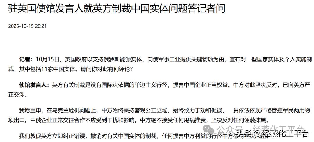 中国驻英大使馆消息,10月15日,驻英国使馆发言人就英方制裁中国实体问题答记者问。