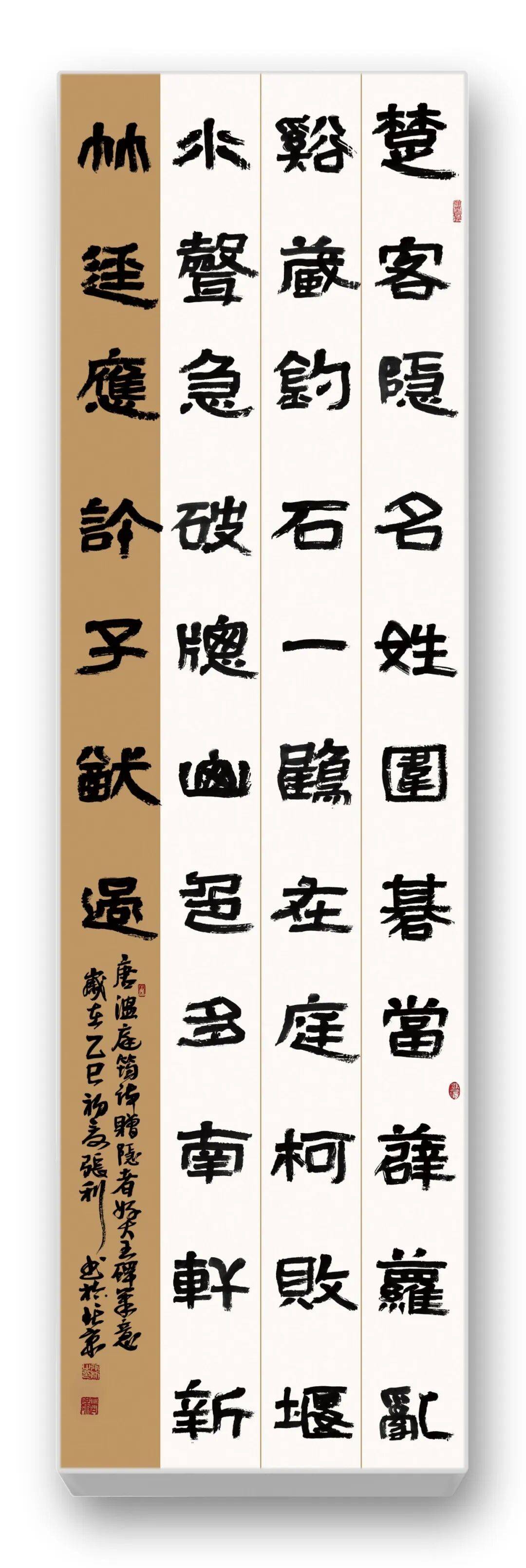 除行楷之外,张利先生对隶书、篆书亦有深入研究,这与他深耕篆刻艺术密不可分。篆刻讲究“书从印入,印从书出”,书法与篆刻的相互滋养,让他的笔墨更添金石之气。其隶书作品取法汉隶经典,秀丽典雅、雄浑古朴在其作品中皆有体现。字形宽博开张,笔画蚕头燕尾特征鲜明,波磔之间力道十足,既有汉隶的庄重古朴,又通过笔画粗细的微妙变化增添了作品的灵动之气,打破了隶书易显呆板的局限,展现出深厚的传统积淀。