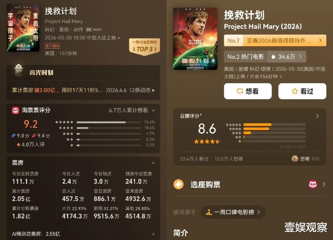 目前上映进入第三周的《挽救计划》依旧势头不减,全球票房已突破4.2亿美元,北美首周8050万,成为2026年最大开画影片。烂番茄95%,豆瓣8.6分,国内上映9天破亿,也是春节档后首部票房破亿院线电影。