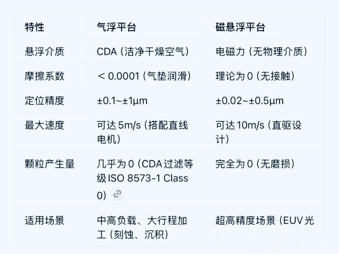 气浮与磁悬浮平台通过“气体垫”或“电磁力”实现stage与基座的无接触悬浮,从根源上解决了机械平台的缺陷,且两者各有技术侧重: