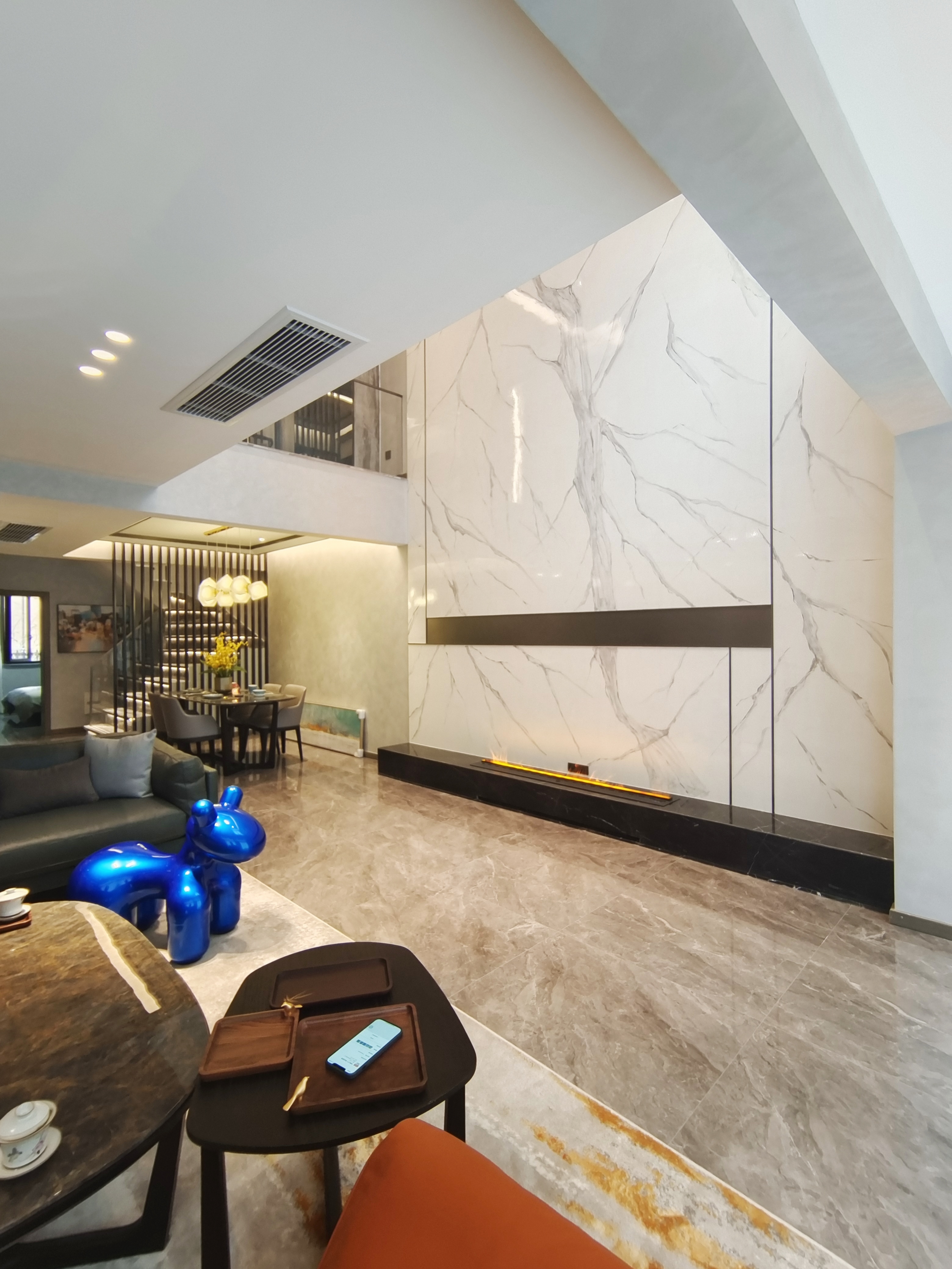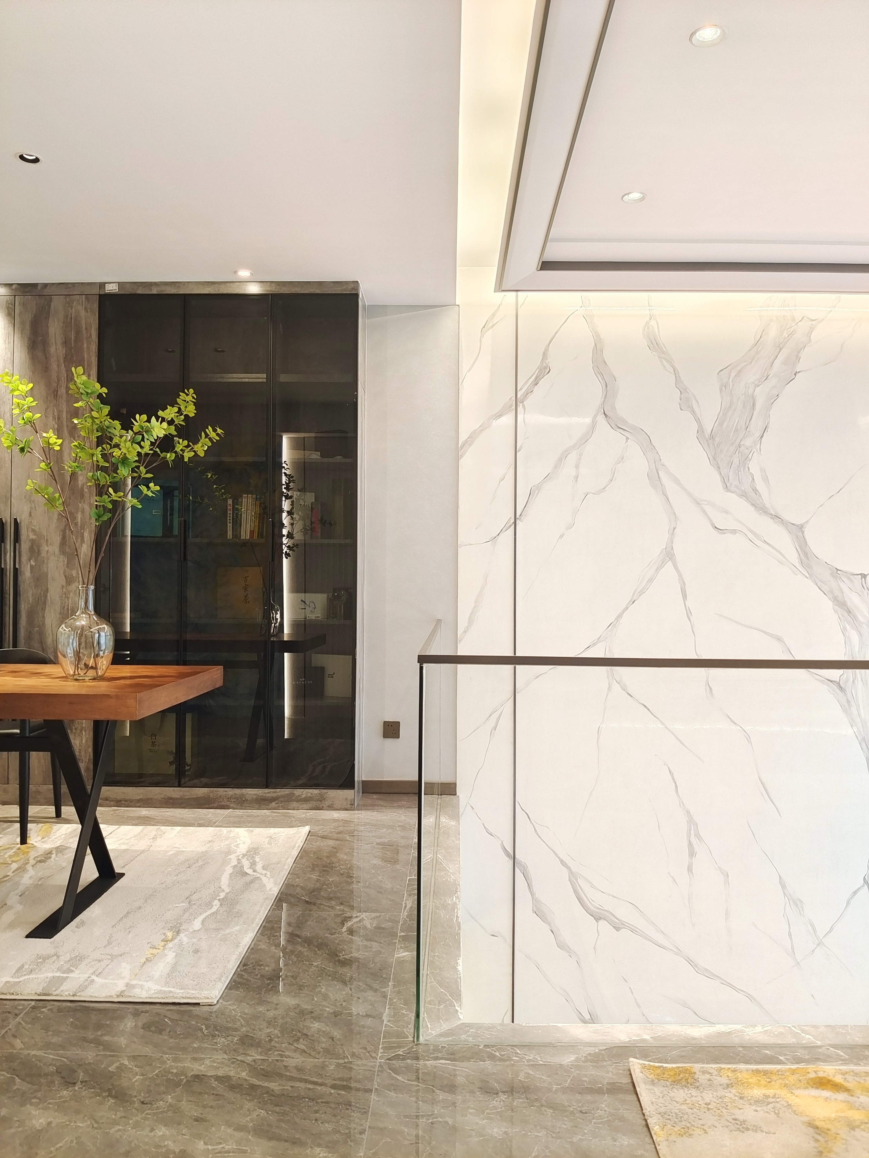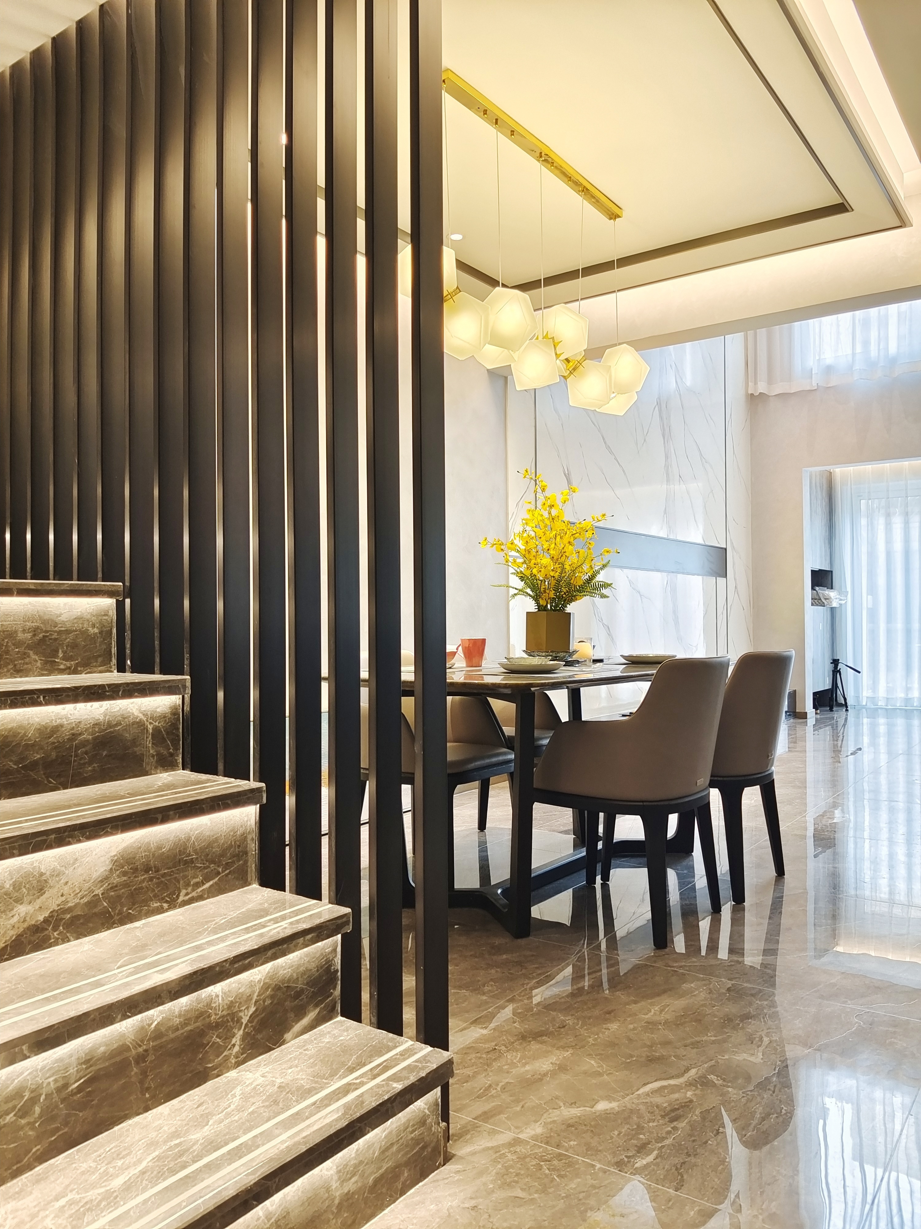 地面通铺微水泥,无缝延展至落地玻璃,内外界面被刻意消解,借庭院的石、砂、孤植勾勒「一室之景」,实现「坐室内,观四时」的东方借景。家具仅设低矮灰麻沙发与极薄岩板几,低姿布局将视觉重心压至地面,强调「水平线」带来的静谧。线性灯带藏于梁缝,2700 K 暖光洗墙,与天窗射入的自然光交织,昼夜交替间呈现不同灰阶,让「光的厚度」取代繁复造型。整体通过材质本色、结构留白与光影叙事,将空间退隐为生活的幕布,使人专注感知时间、风与树影,达成「无风格」的可持续极简,回应「居者即景」的当代精神。
