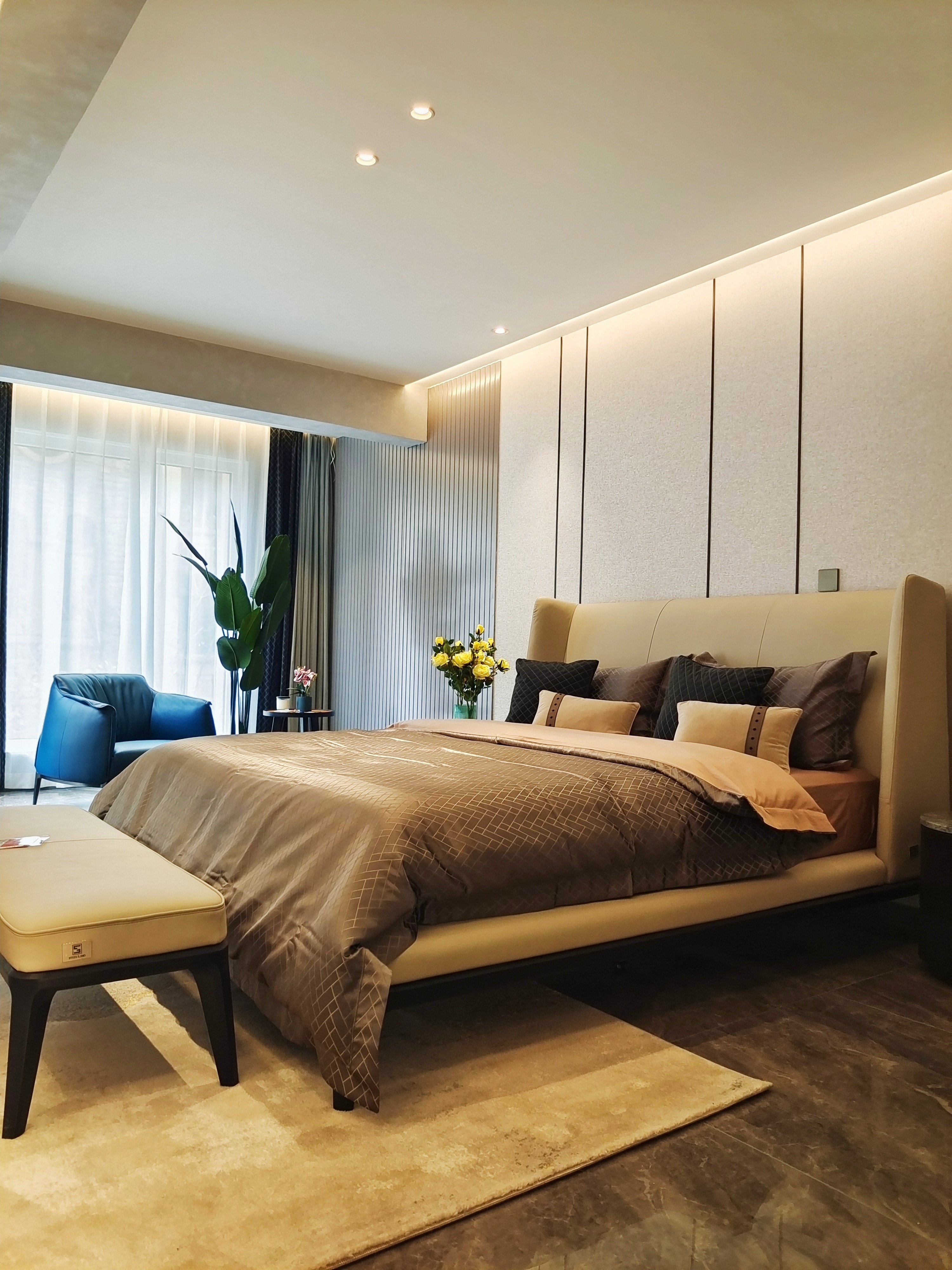保留原建筑清水混凝土顶棚与纵横梁架,将其粗砺灰度作为空间主背景,让结构本身成为最克制的装饰;地面通铺微水泥,无缝延展至落地玻璃,内外界面被刻意消解,借庭院的石、砂、孤植勾勒「一室之景」,实现「坐室内,观四时」的东方借景。家具仅设低矮灰麻沙发与极薄岩板几,低姿布局将视觉重心压至地面,强调「水平线」带来的静谧。线性灯带藏于梁缝,2700 K 暖光洗墙,与天窗射入的自然光交织,昼夜交替间呈现不同灰阶,让「光的厚度」取代繁复造型。整体通过材质本色、结构留白与光影叙事,将空间退隐为生活的幕布,使人专注感知时间、风与树影,达成「无风格」的可持续极简,回应「居者即景」的当代精神。