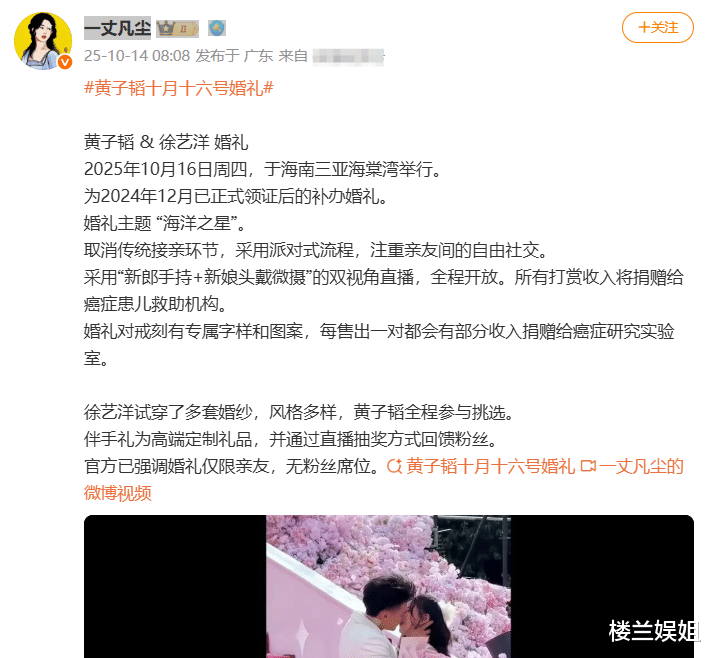 取消伴郎伴娘环节、对戒销售抽成捐癌症研究实验室,还准备通过直播抽奖送粉丝高端定制伴手礼,唯独强调“仅限亲友,无粉丝席位”,既保留私密感又不失温度。