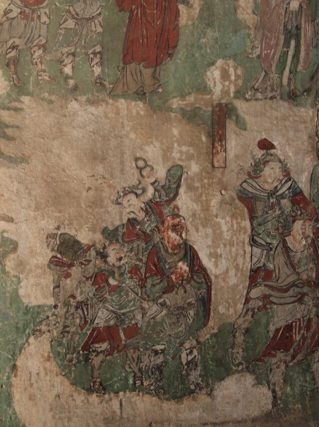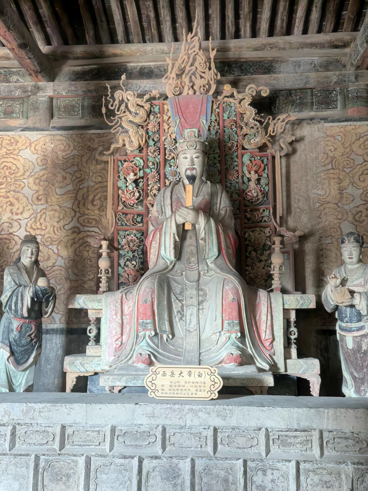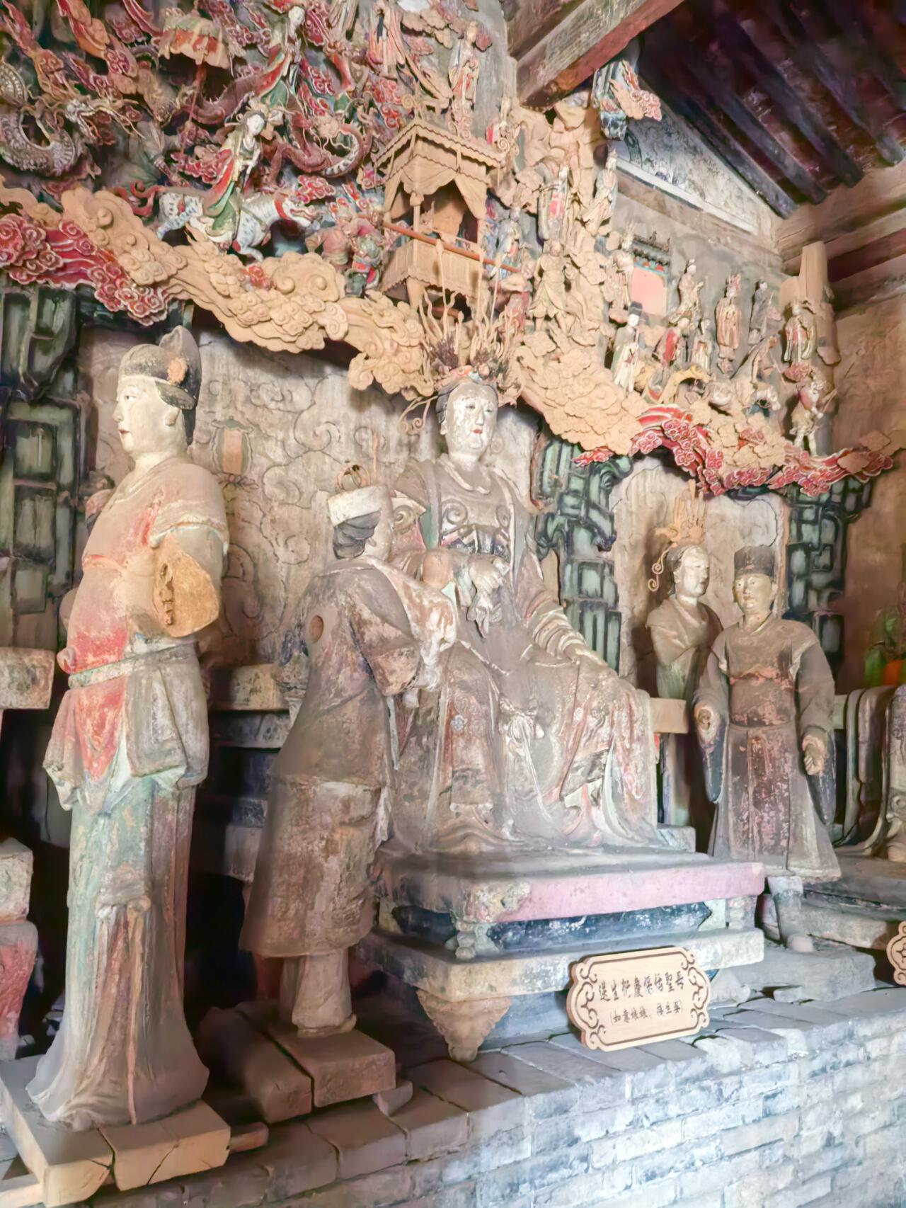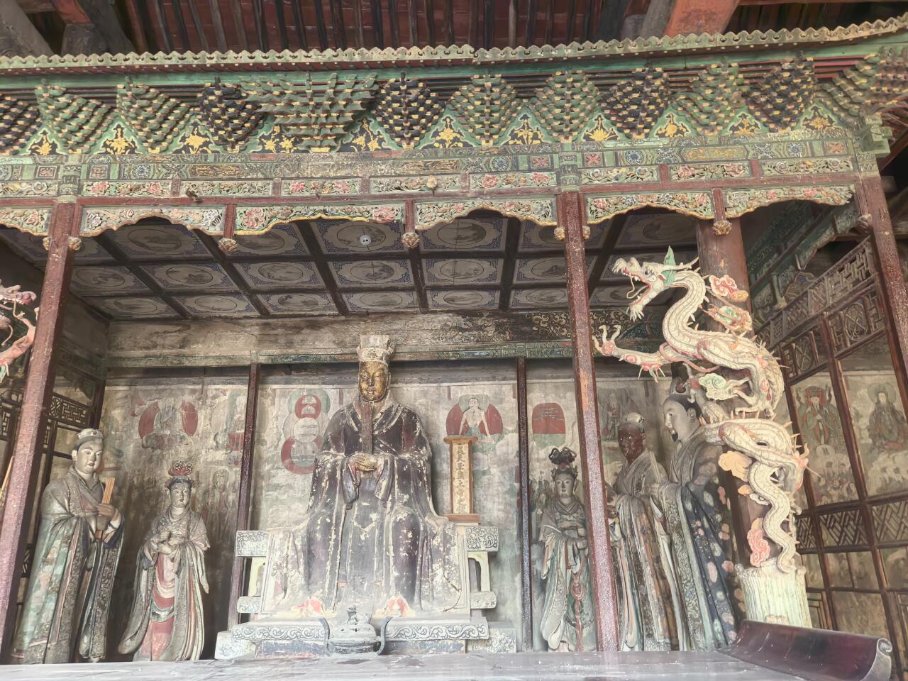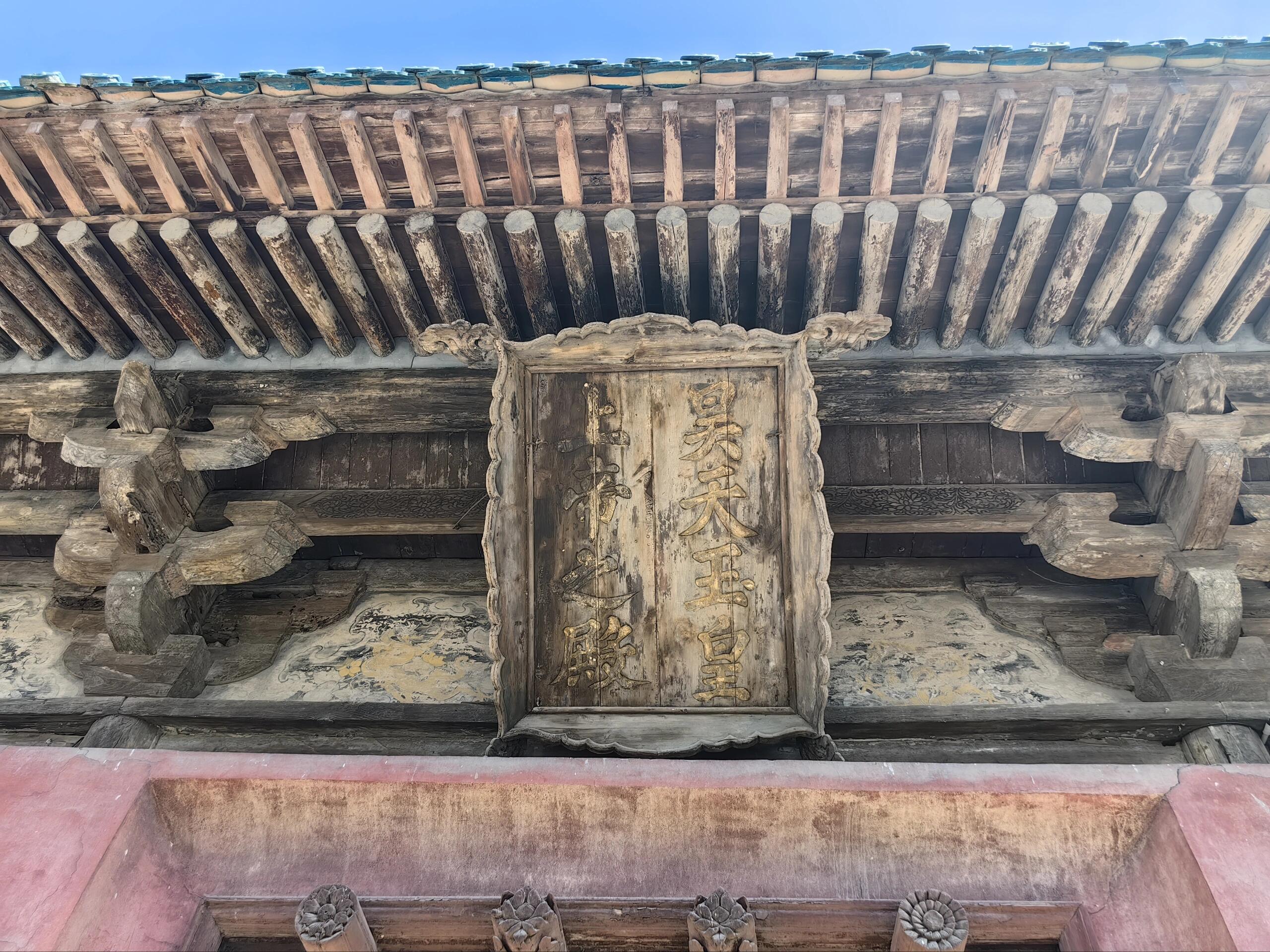 推开明间的木板门,花朵形的门钉硌得手掌生疼。这些看似装饰的细节,实则是金代工匠对力学的精妙运用——凸起的门钉不仅能加固门板,还能分散关门时的冲击力。门上方悬挂的斗匾"昊天玉皇上帝之殿",字体苍劲有力,木质边框雕刻着缠枝纹,历经八百年仍未变形。走进殿内,光线从直棂窗的缝隙中斜射进来,照亮梁架上的彩绘。那些用朱砂、石绿绘制的云纹,虽已黯淡,却仍能让人想象出当年的绚丽色彩。