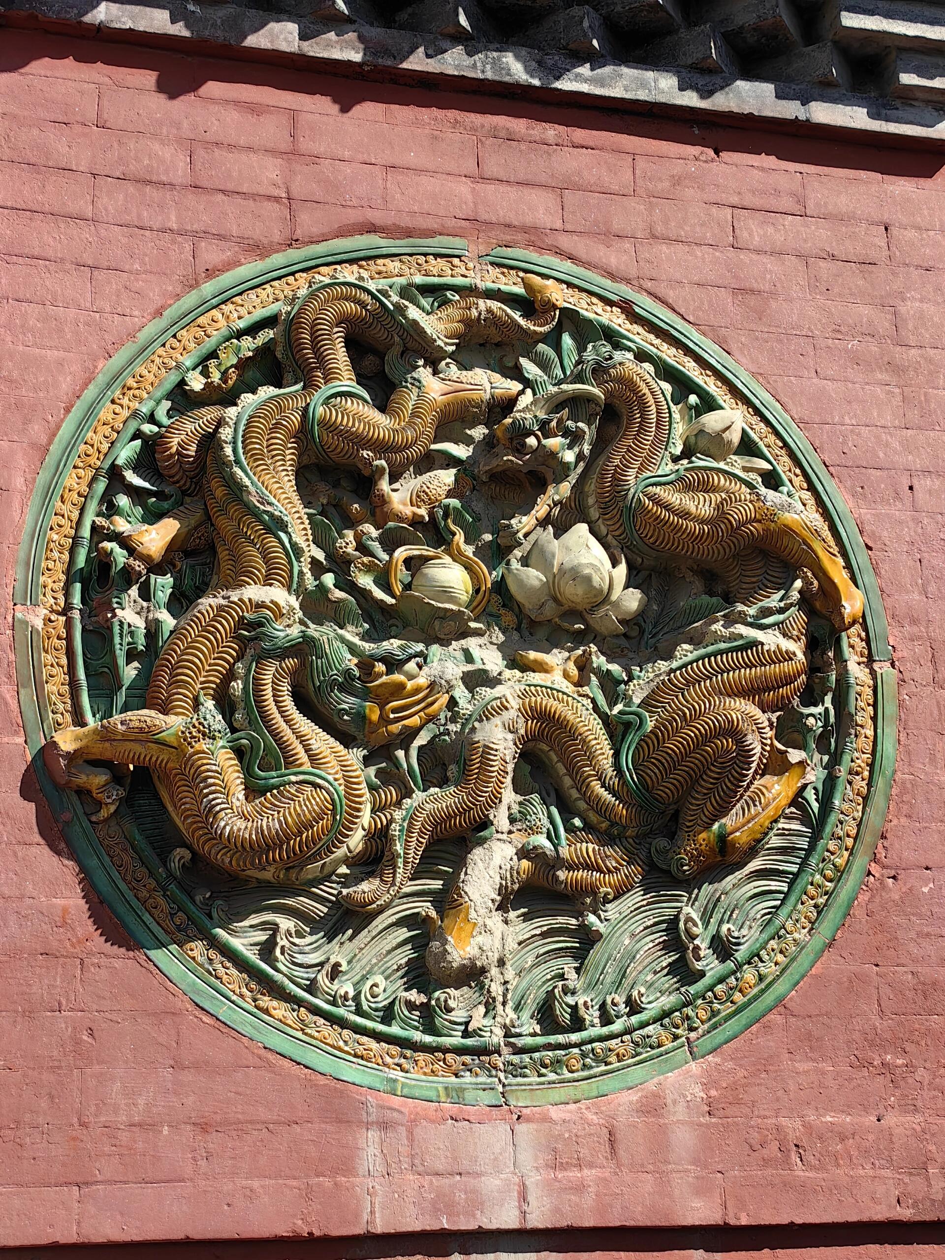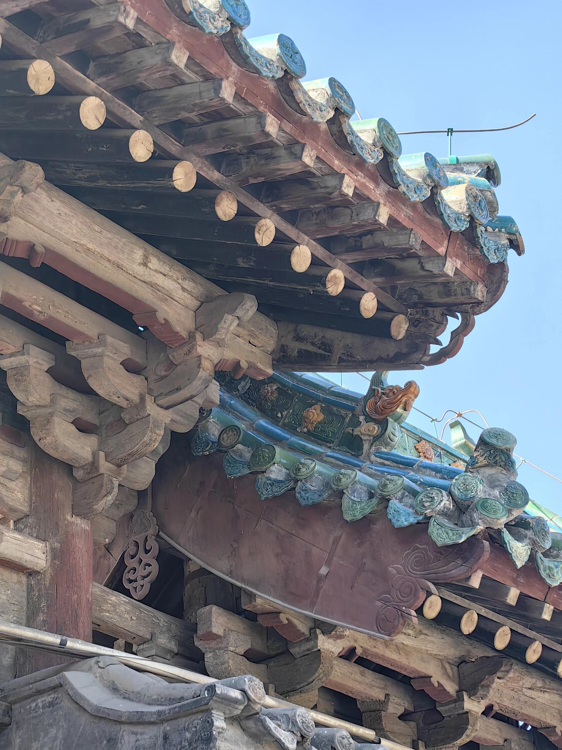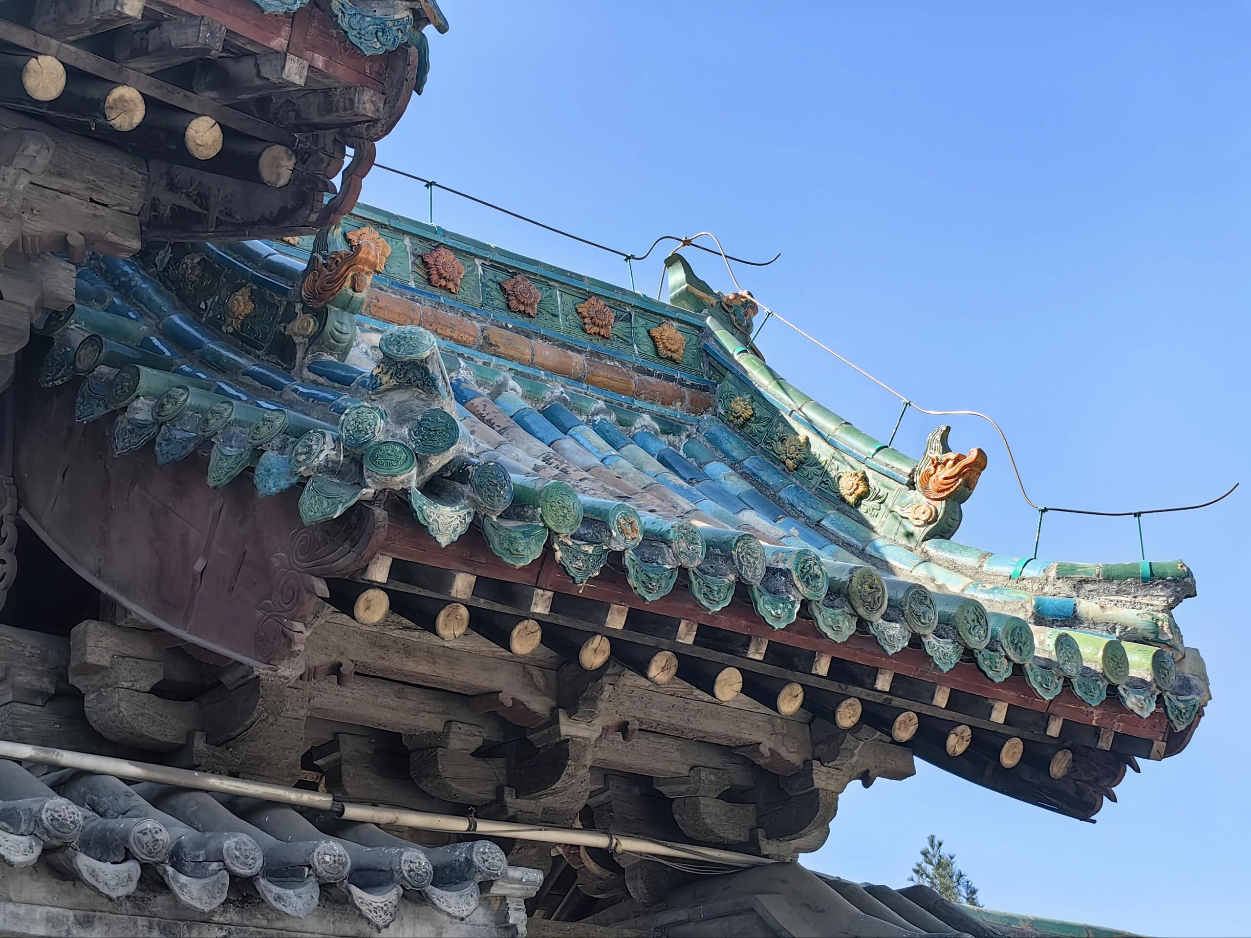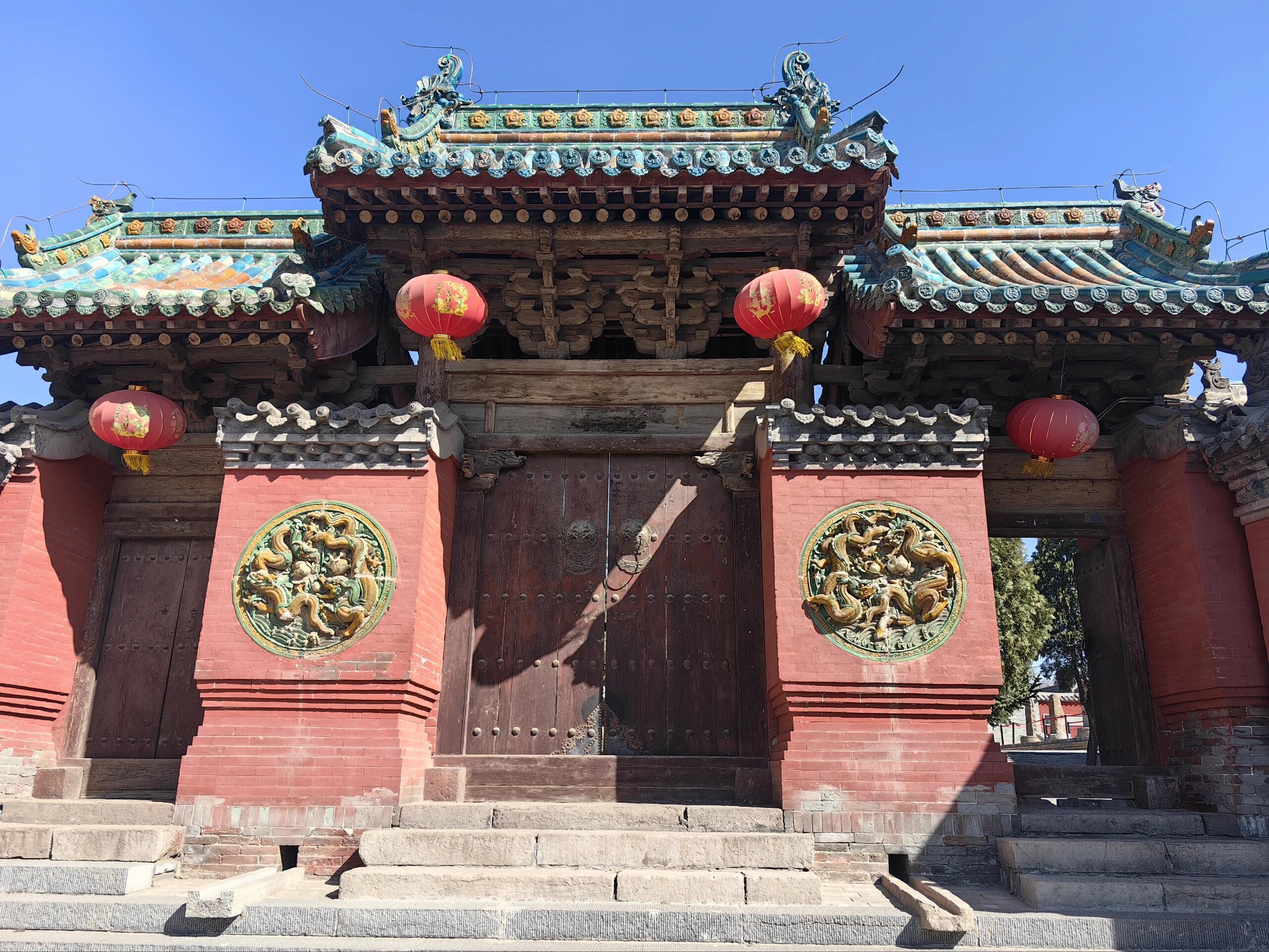 站在条石台基前仰望山门,三座木牌坊并肩而立的模样,像极了古代衙门前持戟而立的侍卫。中门厚重的屋檐下,七踩斗棋层层叠叠,昂头如飞鸟振翅,每一根枋木都带着历经岁月的深褐色包浆。两侧掖门稍显低矮,五踩斗棋却丝毫不减精致,如同侍卫腰间的佩刀,虽不张扬却暗藏锋芒。明代工匠在三座门之间的墙壁上,用琉璃烧制出二龙戏珠的纹样,蓝绿相间的釉色在阳光下流转,龙鳞的纹路细得能看清每一道刻痕,仿佛下一秒就要破壁而出。八字照壁分列两侧,青砖上的雕刻虽已斑驳,却仍能辨出牡丹卷草的繁复图案,这些静默的砖石,都是明代晋中匠人留下的签名。