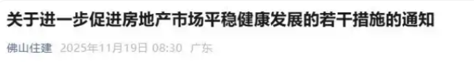 2025年11月19日,广东省佛山市宣布了12项新的房地产市场政策,立即生效。