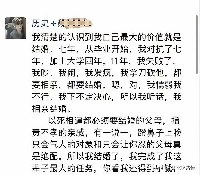另外,总以为自己可以说服父母,可惜你这一步步的妥协,最终拖垮的是自己,就算前一天发了取消婚礼,最终还是妥协,以至于到了结婚那天,自己再也兜不住了,压垮了。