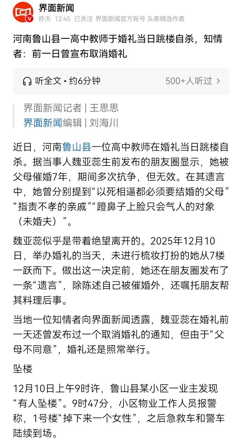 应该珍惜生命,父母给的压力再大,也不应该轻生,不想结婚也不应该跑到男方那边的婚房轻生,这不还连累了住在1楼的业主。