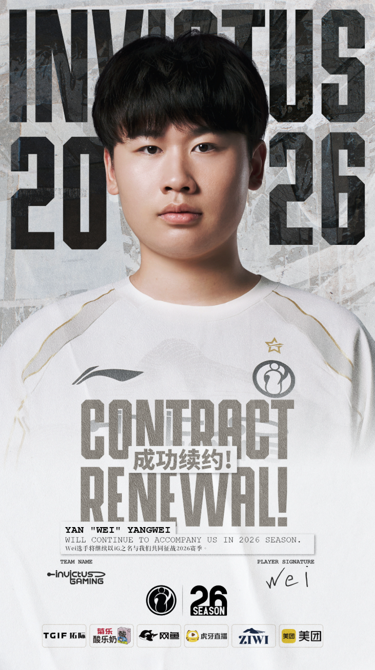 Wei续约1年。打野选手闫扬威(ID: Wei)完成续约,新赛季将继续以iG之名征战。
