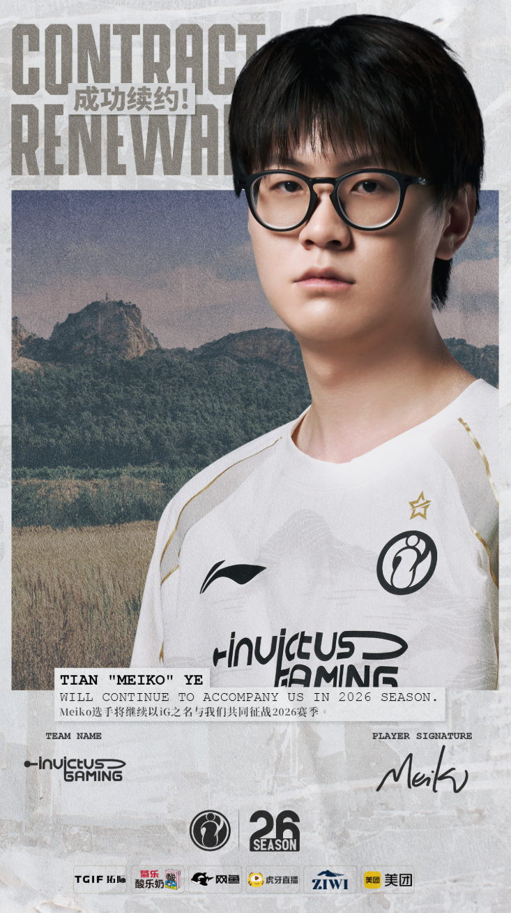 Meiko续约1年。辅助选手田野(ID: Meiko)完成续约,新赛季将继续以iG之名征战。