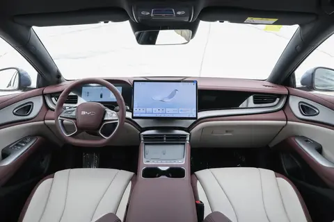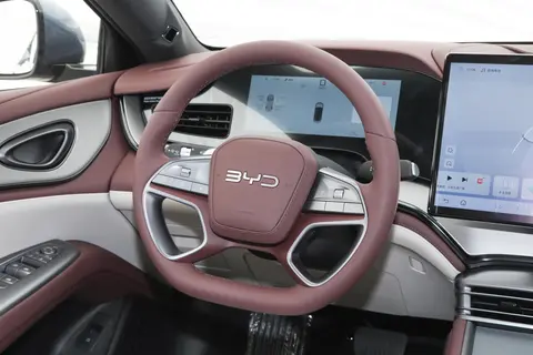 进入车内,最直接的感受就是质感做得比老款细致了许多。中控台和门板大面积软包,皮质和缝线处理得很规整,摸着温润不生硬。车门开合的阻尼和密封感也好于预期,关门声音很扎实,静谧性不错。中控屏是比亚迪家族式大屏,可以旋转,UI交互做得挺人性化,反应速度快,常用功能都能语音控制。家里老人对新车的屏幕操作还有点担心,实际体验下来觉得还是比较容易上手的。